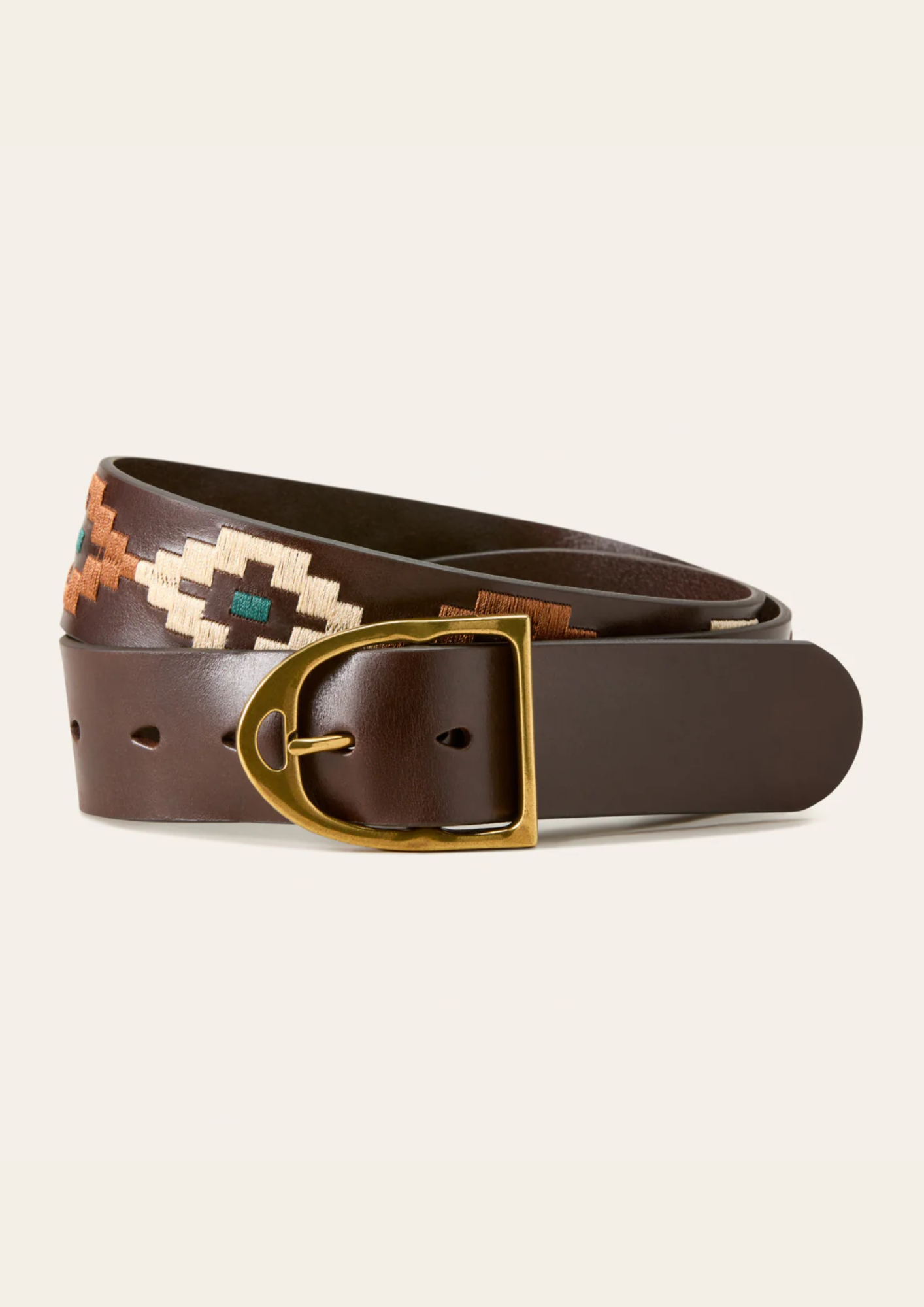 Embody the spirit of the Wild West with the Ariat Rio Belt! Featuring a unique stirrup inspired buckle and intricate embroidered detail, this genuine leather belt brings a touch of western style to any outfit. Elevate your look and embrace your inner cowgirl with the Rio Belt.