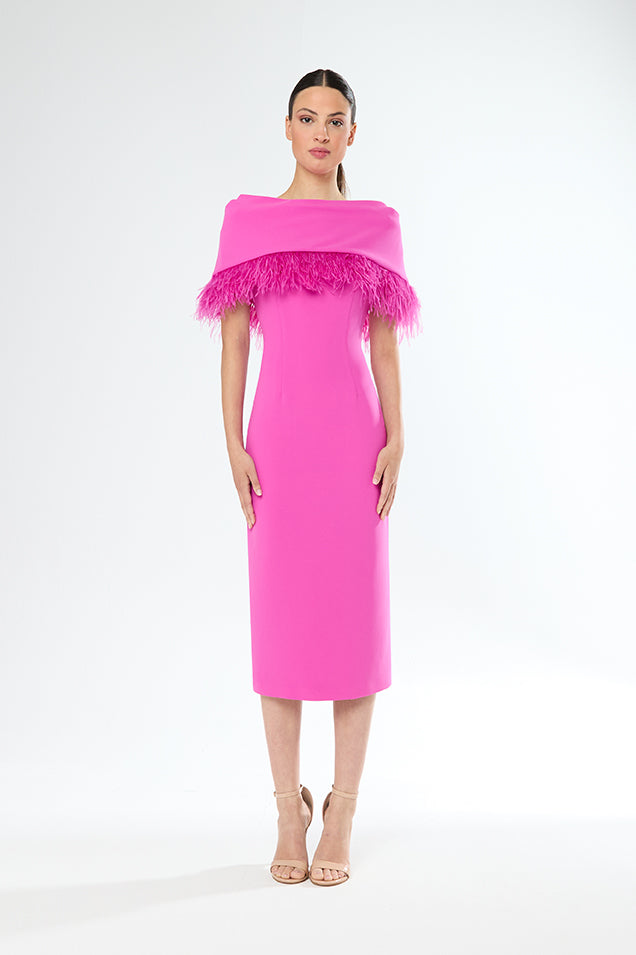 Experience elegance like never before with the Carla Ruiz Feather Cape Dress. Featuring stunning feather cape details, this slim fit, midi length dress is perfect for any special occasion. Make a statement and turn heads with this luxurious and unique dress.