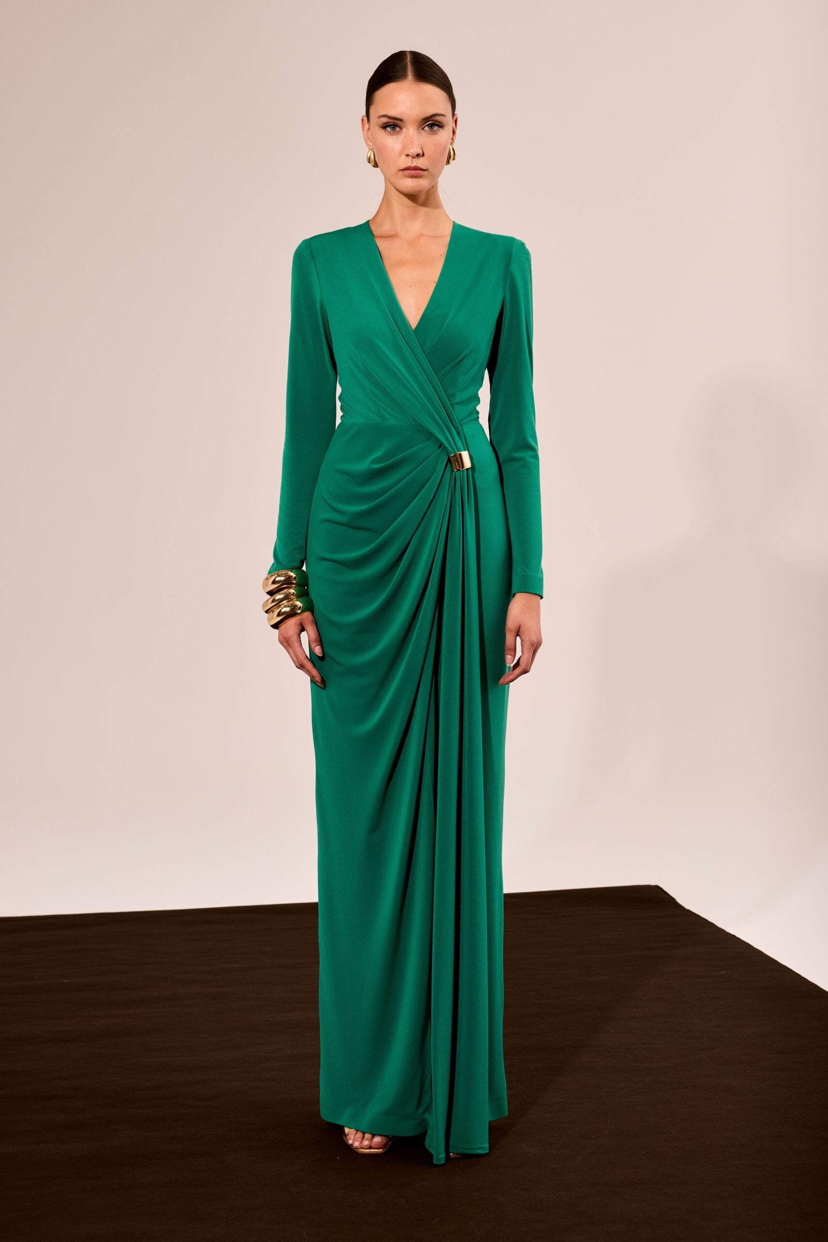 Elevate your wardrobe with the Carla Ruiz Long Knot Dress, designed for special occasions. Featuring an elegant V-neck and a stylish knot detail accented by a subtle gold brooch, it offers a sophisticated touch. The maxi length and long sleeves create a graceful silhouette, perfect for making a lasting impression. This dress combines refined style with flattering details to ensure you look polished and confident at every event.