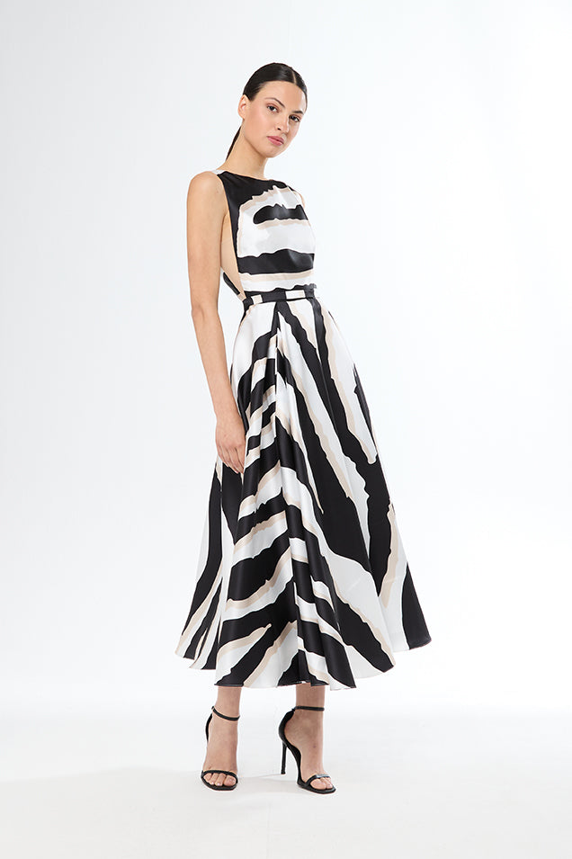 Step into style with the Carla Ruiz Mikado Midi Dress. This sleeveless number boasts a playful black and white pattern, perfect for any occasion. Its midi length and round neck make it both fashionable and formal. Dress it up or down, this dress is sure to make a statement.