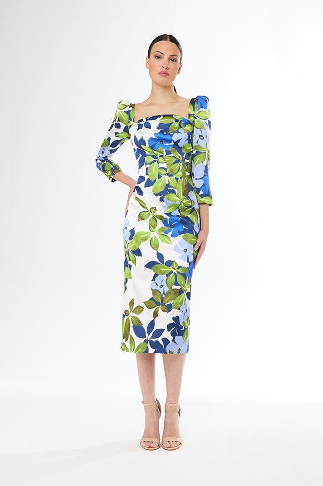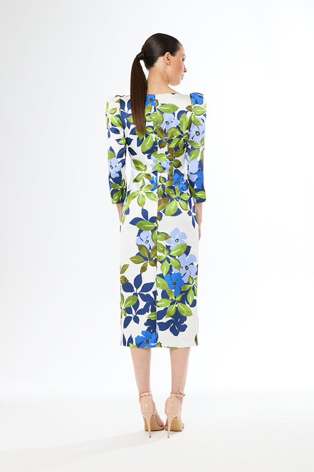 Elevate your style with the Carla Ruiz Straight Midi Dress! The 3/4 length sleeves and puff shoulders add a touch of sophistication, while the straight cut and midi length bring a flattering silhouette. The beautiful floral print makes it perfect for any formal occasion!