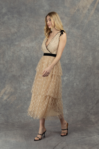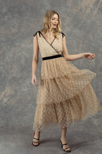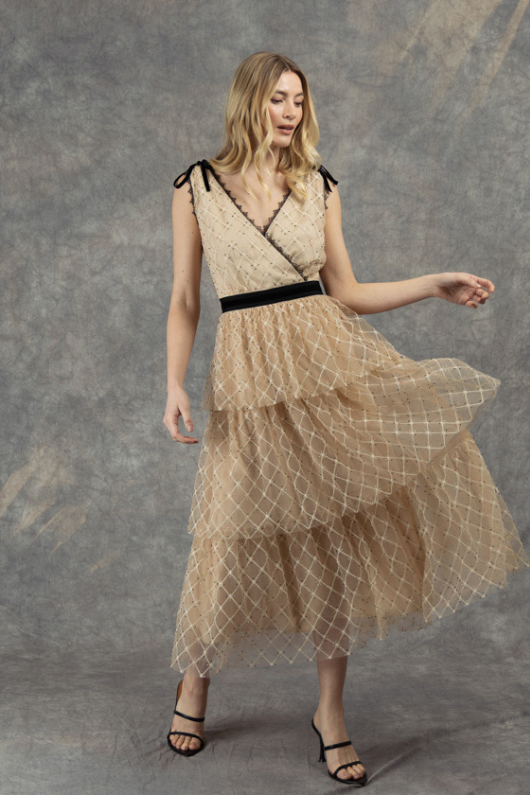 This Fee G Tiered Mesh Dress is perfect for a special occasion. It features a cream mesh fabric with tiered detail, and black belt detail around the waist for a stylish silhouette. Crafted with quality materials, this dress is sure to make a lasting impression.