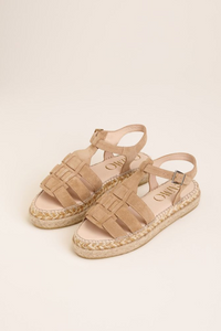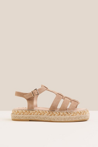 Introducing the Livia Platform Sandal, designed by Gaimo for women seeking both style and comfort. These espadrille sandals feature velvet-finish leather, an open toe, and an ankle strap with side buckle for a secure fit. With a 3.2cm double platform made of 100% organic jute, these sandals are perfect for summer holidays. Get yours now and strut into your vacation with style!