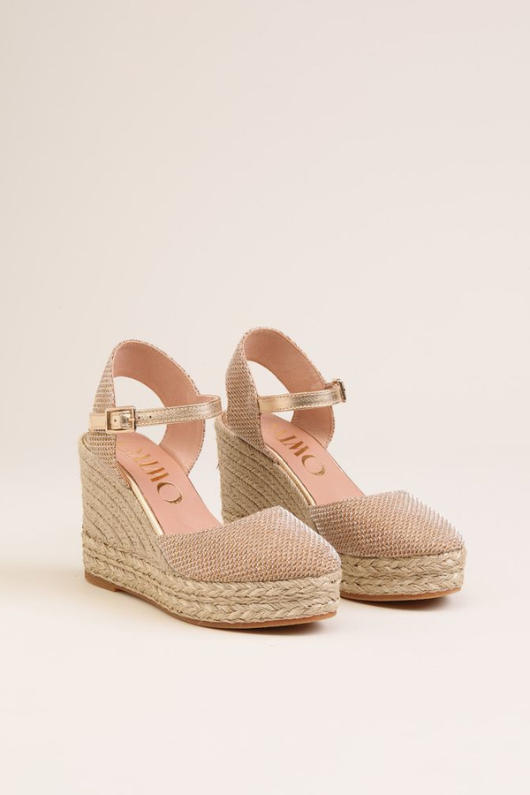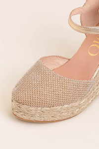 Elevate your style with the Tiri Wedge High Sandal from Gaimo. These women's espadrille wedges feature a metallic mesh fabric detail and a 9.5cm organic jute wedge, giving you both comfort and a striking finish. With a closed toe and open heel design, a strap with buckle at the ankle, and leather cushioned lining and insoles, these sandals are the perfect combination of fashion and function. Step out confidently in these platform wedges.