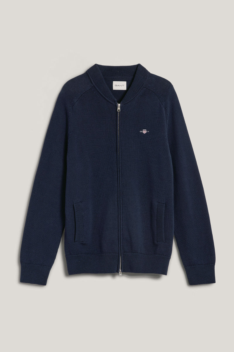 Introducing the Gant Casual Cotton Bomber Cardigan, made with fine knit cotton for ultimate comfort. Stay stylish with its embroidered Gant logo and ribbed detailing. Functional pockets and a two way zip fastening make it a practical addition to your wardrobe.