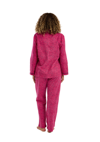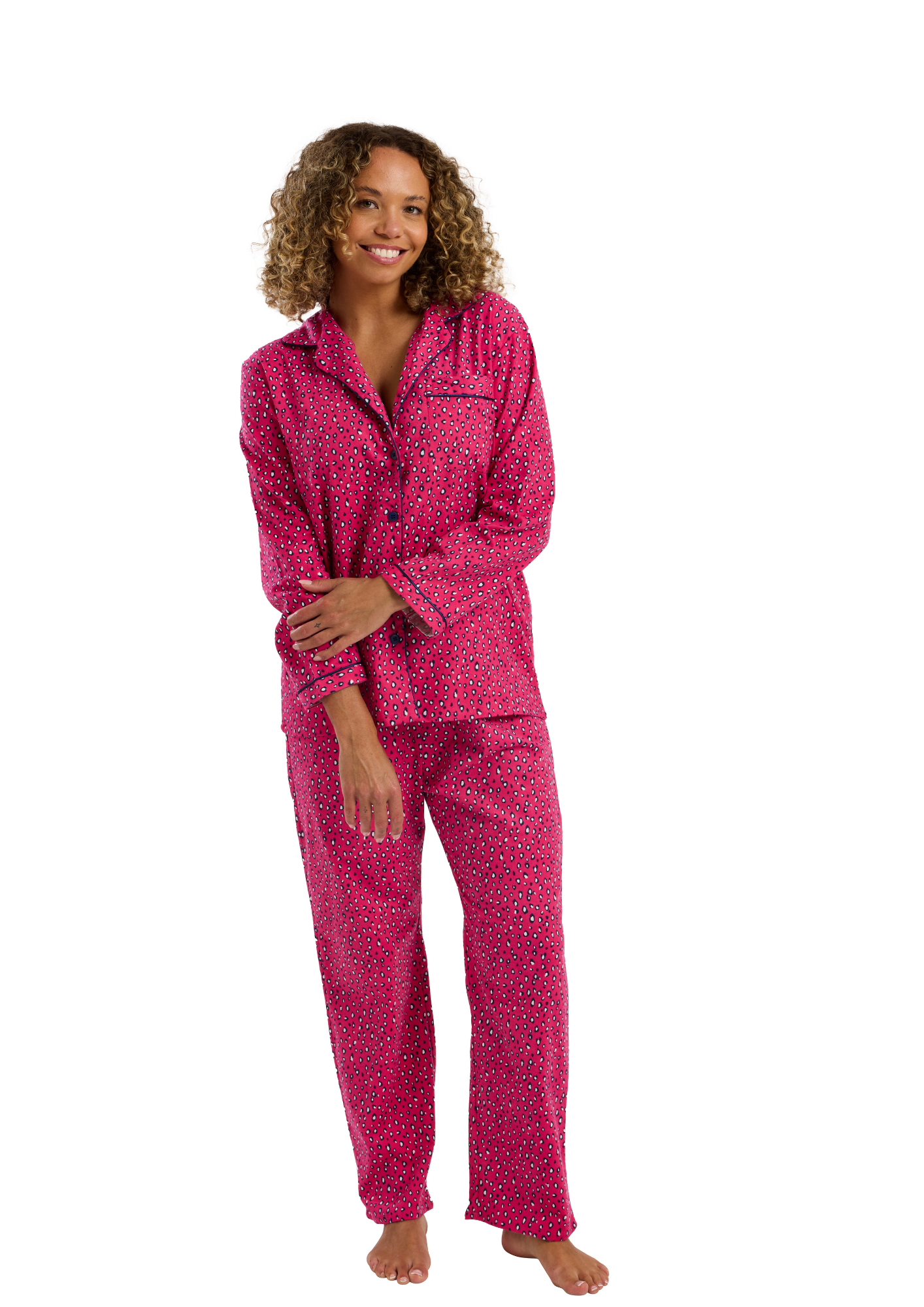 Experience comfort with a touch of wild elegance in the Marsylka Bright Animal Wincey Pyjama. This women's set features long sleeves with a classic collar and button fastening for a tailored look, complemented by a handy chest pocket. The trousers balance style and ease, while the silky animal print fabric offers a soft, luxurious feel against your skin, perfect for lounging or a restful night's sleep. Embrace sophistication and comfort effortlessly.