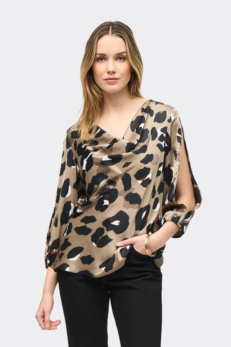 This Joseph Ribkoff Animal Print Top exudes sophistication and exclusivity with its cowl neck and long puff sleeves. The open sleeve design adds a touch of glamour to the satin feel of this top. Its animal print adds a bold and luxurious touch, making it the perfect statement piece for any fashion-forward individual.