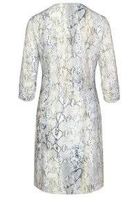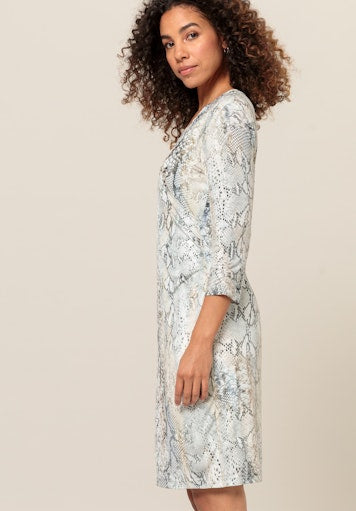 The Bianca Wenke Dress is the perfect blend of style and comfort. Boasting a sensible knee length and flattering slim fit, this dress features a trendy animal print, 3/4 length sleeves, and a V-neck for a touch of sophistication. Make a statement with this versatile piece for any occasion.