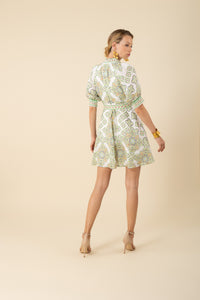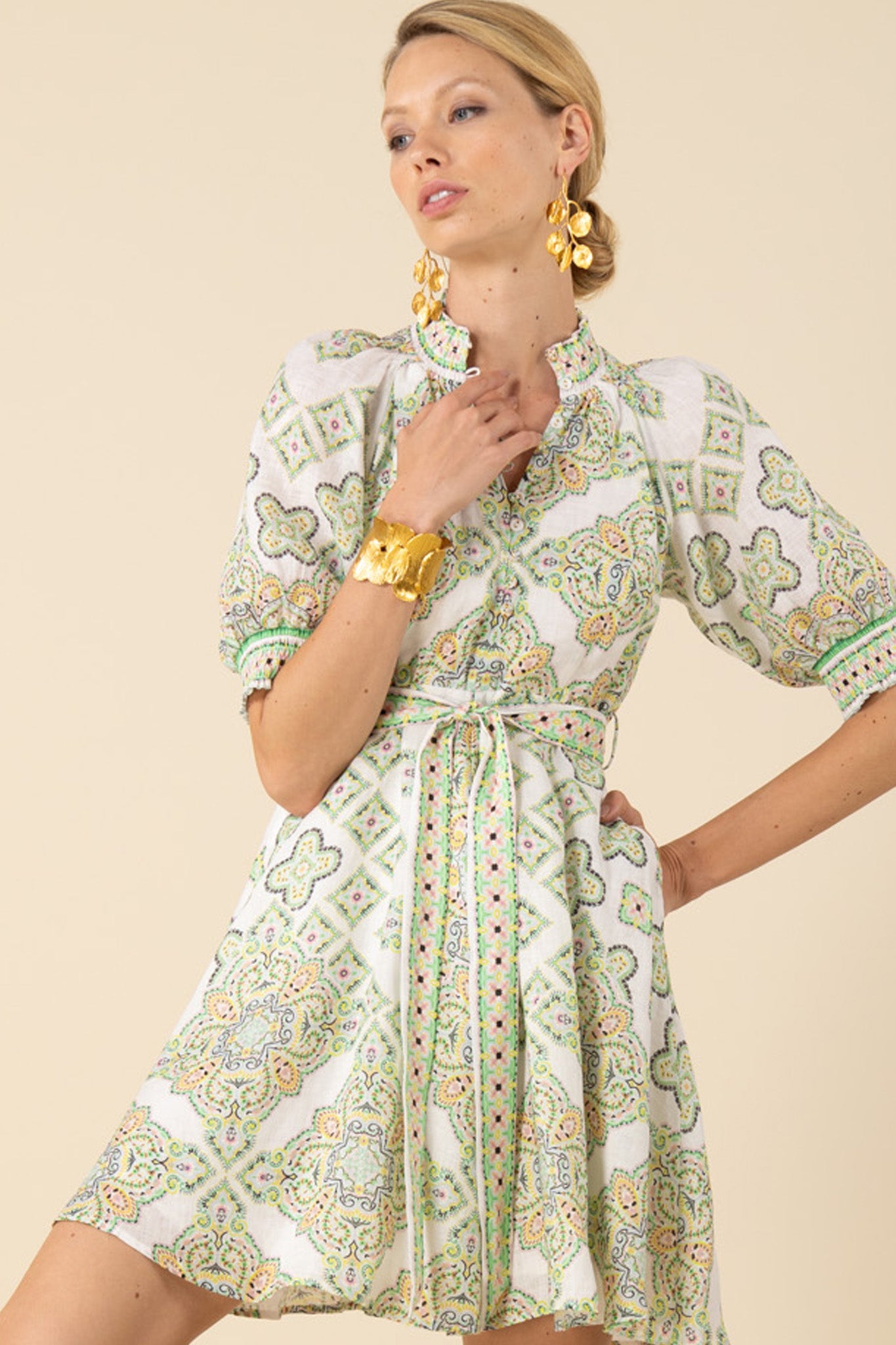 The Hale Bob Naya Dress is the perfect combination of style and comfort. Made from washed linen, its body is lined for a soft and breathable feel. The button closure at the front neck and invisible zip at the back provide a seamless fit, while the short smocked cuffs add a touch of elegance. With a self-tie belt at the waist, a swingy A-line skirt, and pockets at the hips, this dress is both practical and stylish.