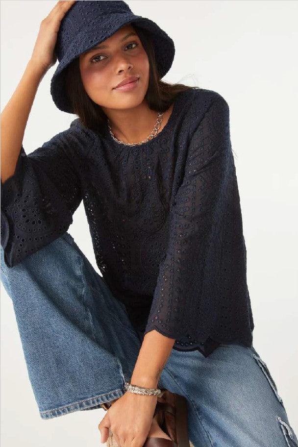 The BA&SH Bruna Shirt evokes the stylish spirit of the 70s, with its A-line cut, round neck, and flared sleeves. Adding an elegant touch, the intricate broderie anglaise detailing adds dimension and texture. Elevate your wardrobe with this timeless piece.