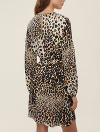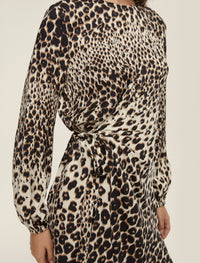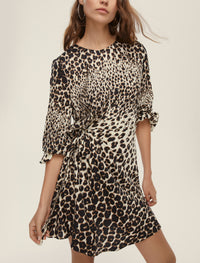 The Emme Delfi Dress features a chic animal print and a sophisticated tie knot detail that enhances its elegant silhouette. Designed with 3/4 length sleeves, it offers a refined touch. The round neckline and mini length create a balanced, stylish look perfect for both day and evening occasions.