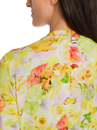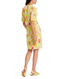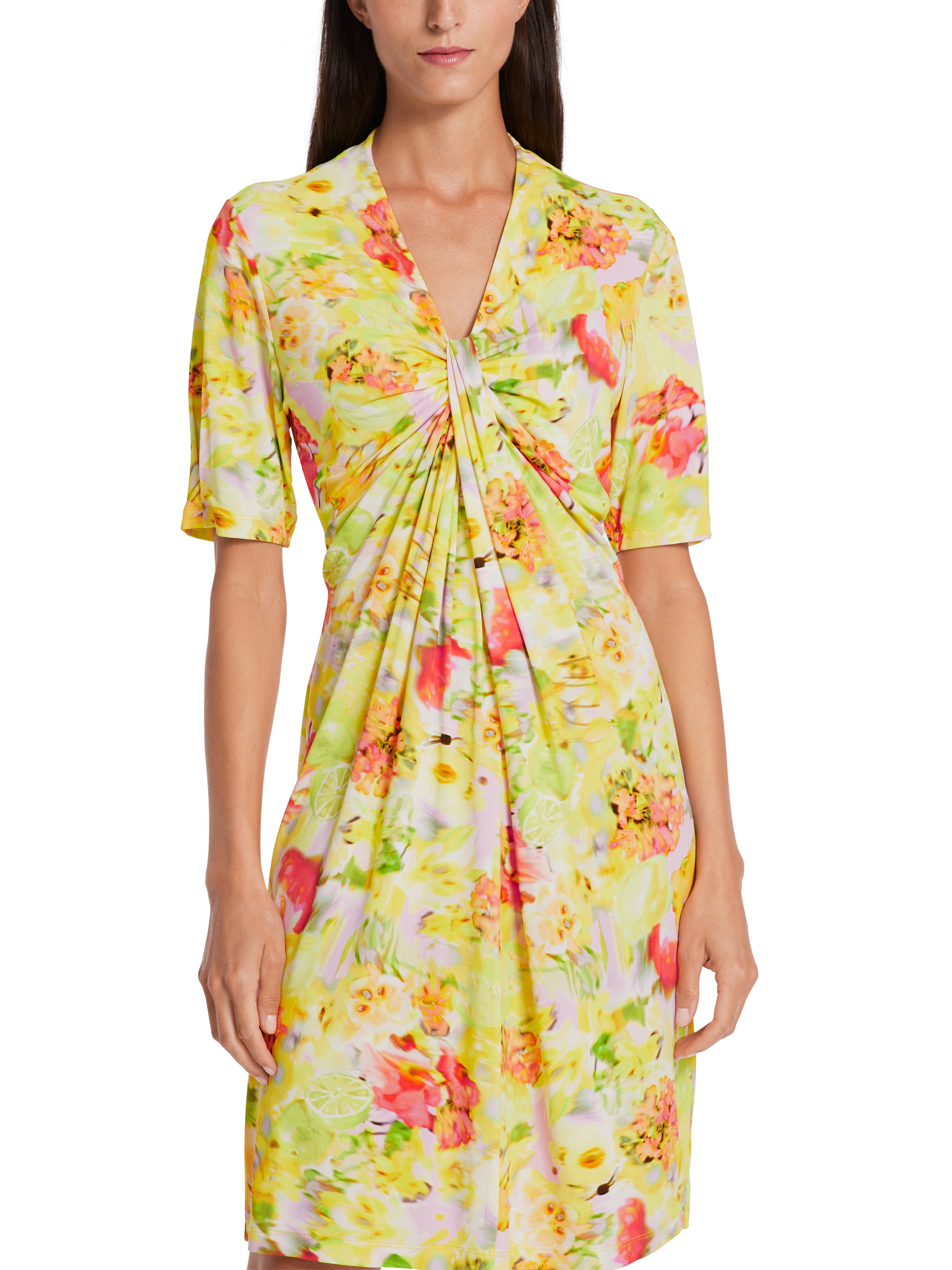Introducing the Marc Cain Floral Dress. This elegant dress boasts a fitted silhouette that flatters the figure, with short sleeves and a knee-length hem. The V-neck is adorned with a knot effect for added style. Perfect for any occasion, this dress will make a statement with its feminine and chic design.