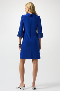 This elegant knee-length Joseph Ribkoff Dress features a flattering cowl neck and stylish three-quarter bell sleeves finished with a delicate fringe hem. Unlined for a lightweight, comfortable fit, it effortlessly combines sophistication with a touch of playful detail, making it perfect for dressier occasions.