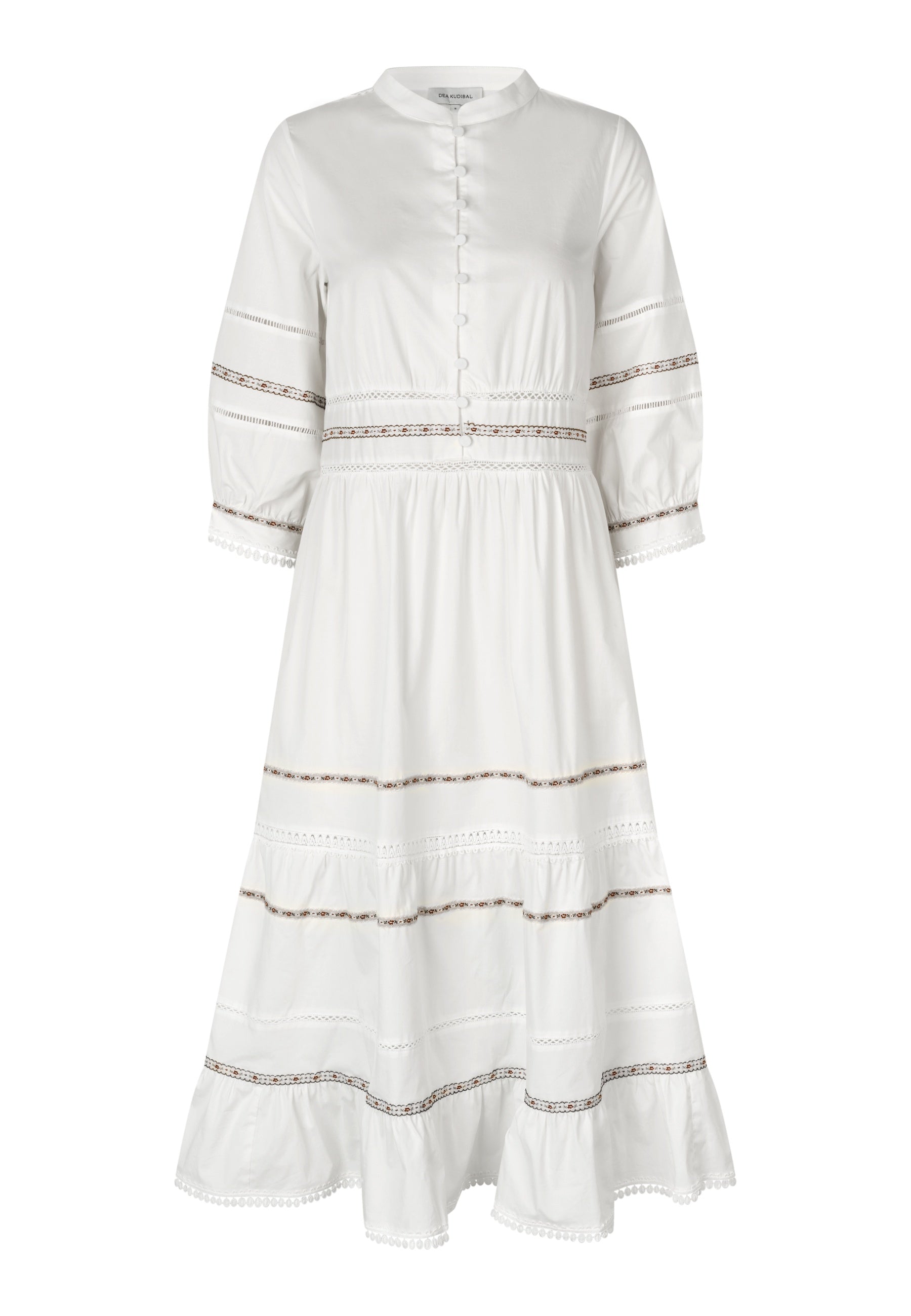 Indulge in sophistication with the Dea Kudibal Heikedea Dress. Its stand collar and 3/4 length sleeves exude elegance, while the midi length and embroidered details add a touch of exclusivity. With a button fastening, this dress is perfect for any occasion. Elevate your wardrobe with this luxurious piece.