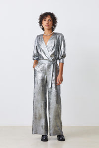 Elevate your wardrobe with the Suncoo Jake Trousers, featuring a sleek silver sheen and a sophisticated wide-leg silhouette. Designed with a comfortable elasticated waistband and practical pockets, these full-length trousers combine style and ease effortlessly. Perfect for adding a touch of fun and refinement to any outfit.