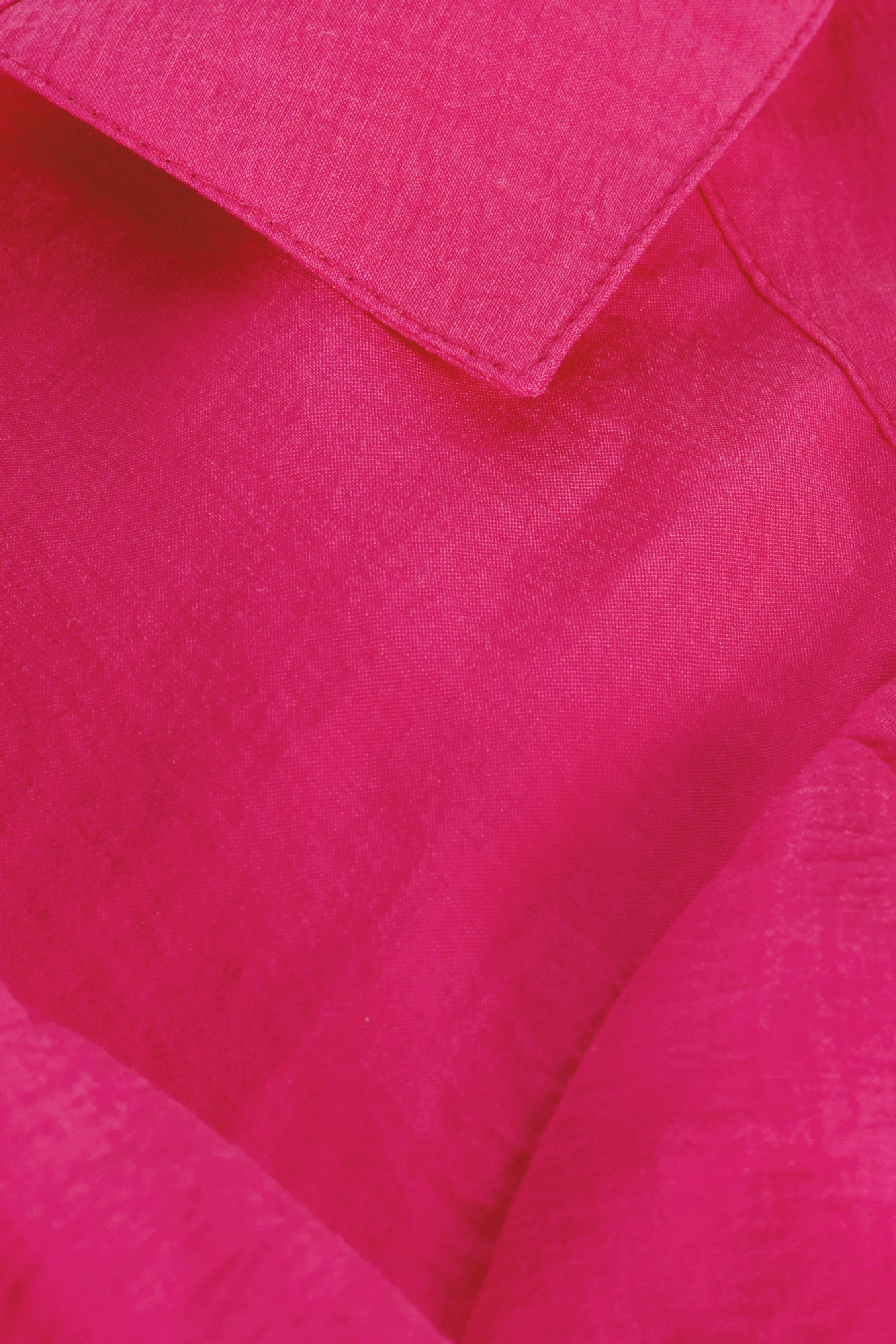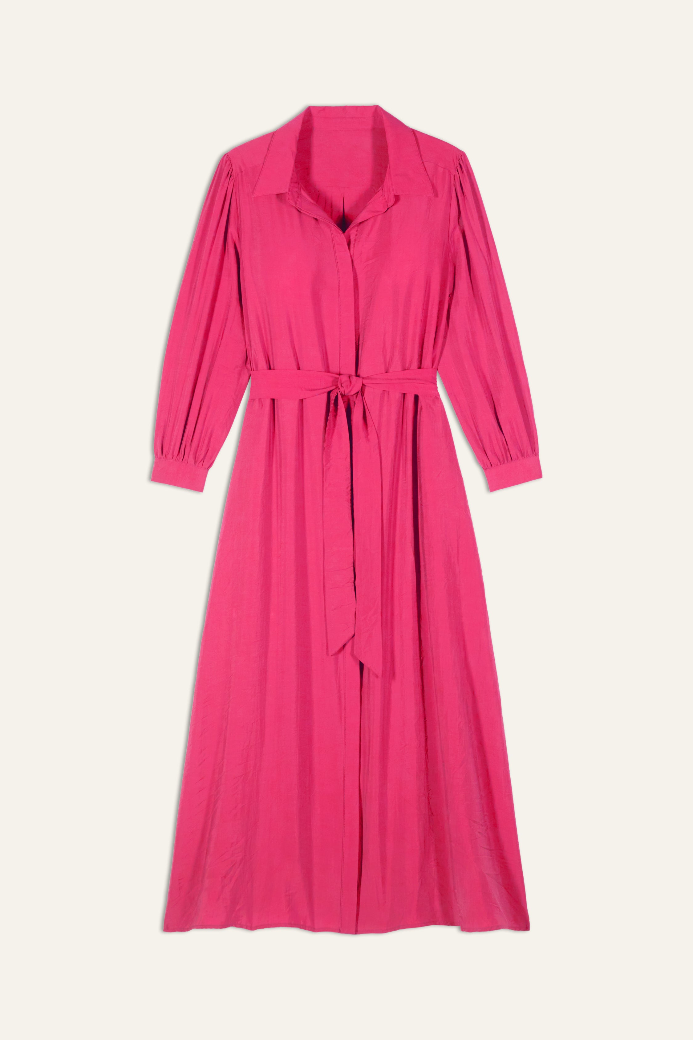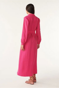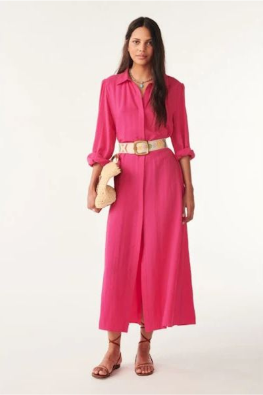 Introducing the BA&SH Lara Shirt Dress. This stylish dress features a midi length and long sleeves for a versatile look. The shirt collar and buttons add a touch of sophistication, while the tie belt accentuates your waist for a flattering silhouette. Perfect for any occasion, from work to a night out.