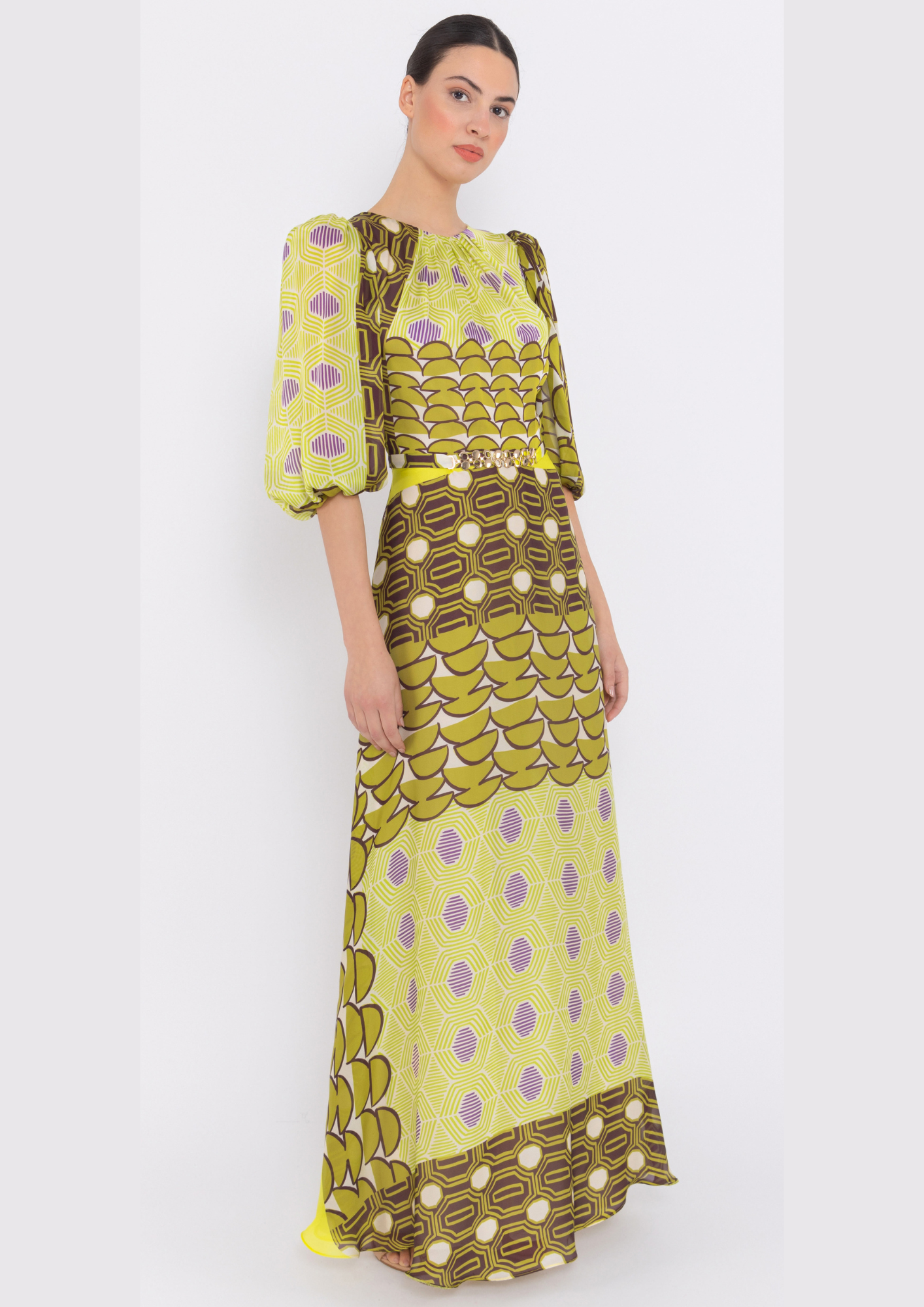 The Carla Ruiz Long Dress features elegant 3/4 length puff sleeves and a flattering round neck, creating a timeless silhouette. The unique pattern adds a distinctive touch, while the gold belt detail accentuates your waist for a polished finish. Perfect for making a statement at any occasion, this dress combines style and sophistication effortlessly.
