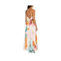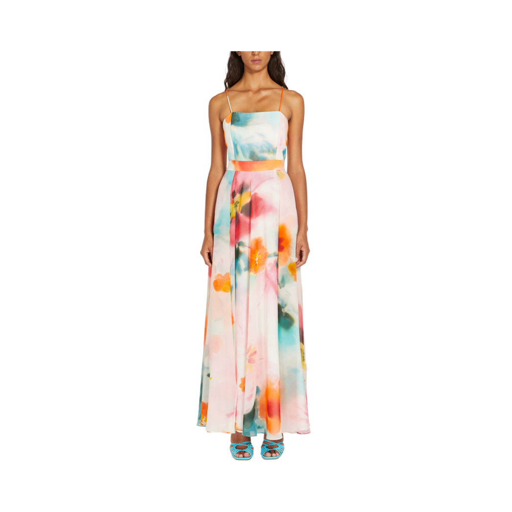 Marella women's dress with a beautiful and vibrant watercolour print all over, open back with thin cross over straps and concealed zip on the back.