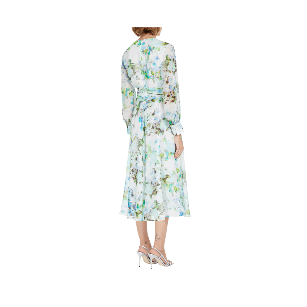 Marella women's long dress with unique floral print all over, V neck, cuffed long sleeves and matching belt.