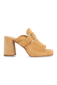 Expertly crafted with an Alpe design, these suede platform sandals feature an open toe for maximum breathability and a sleek gold buckle detail for added style. With a comfortable backless design and a 8.5cm block heel, these slip-ons elevate any outfit.