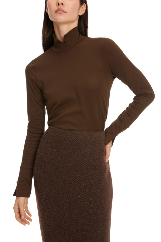 Elevate your everyday wardrobe with the Marc Cain High Neck Top! The stylish high neck with cut-out detail and long sleeves creates a sleek and modern look. Its regular fit makes it perfect for any occasion. add a touch of chic style to any outfit with our High Neck Top!