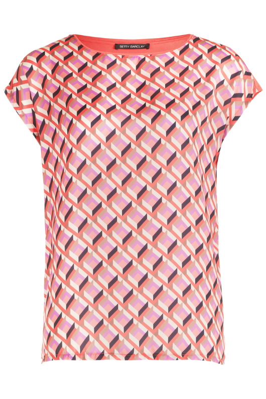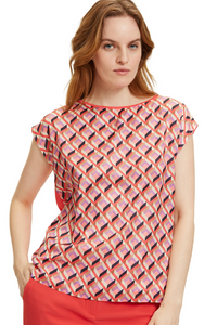 Elevate your wardrobe with the Betty Barclay Cap Sleeve Blouse Top! This figure-skimming blouse features short cap sleeves and a bateau neckline for a flattering silhouette. The front boasts a striking geometrical print, while the back remains plain for a classy look. Perfect for adding a touch of elegance to any outfit.