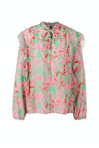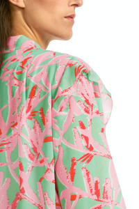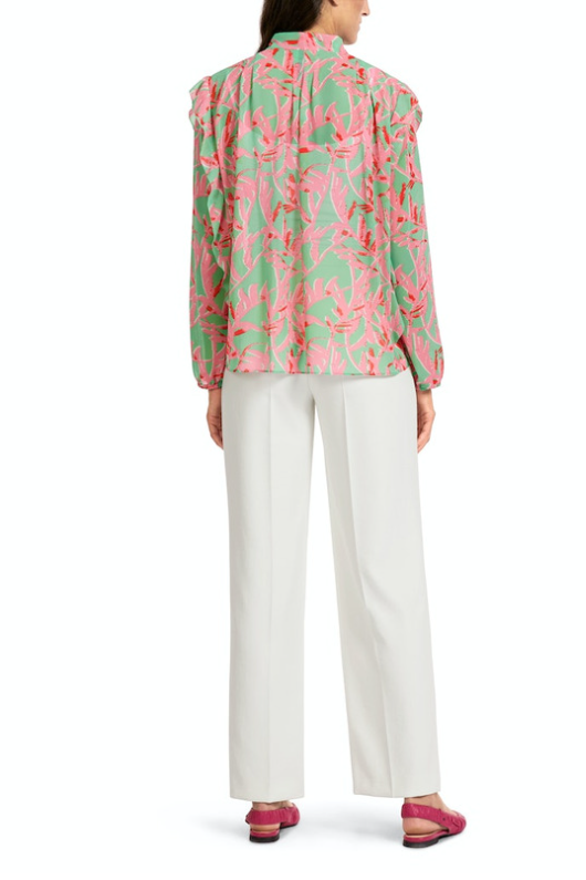 Marc Cain blouse with floral pattern all over, bow tie neck, stretchy cuffs and frills on the shoulders for a floaty and relaxed silhouette.