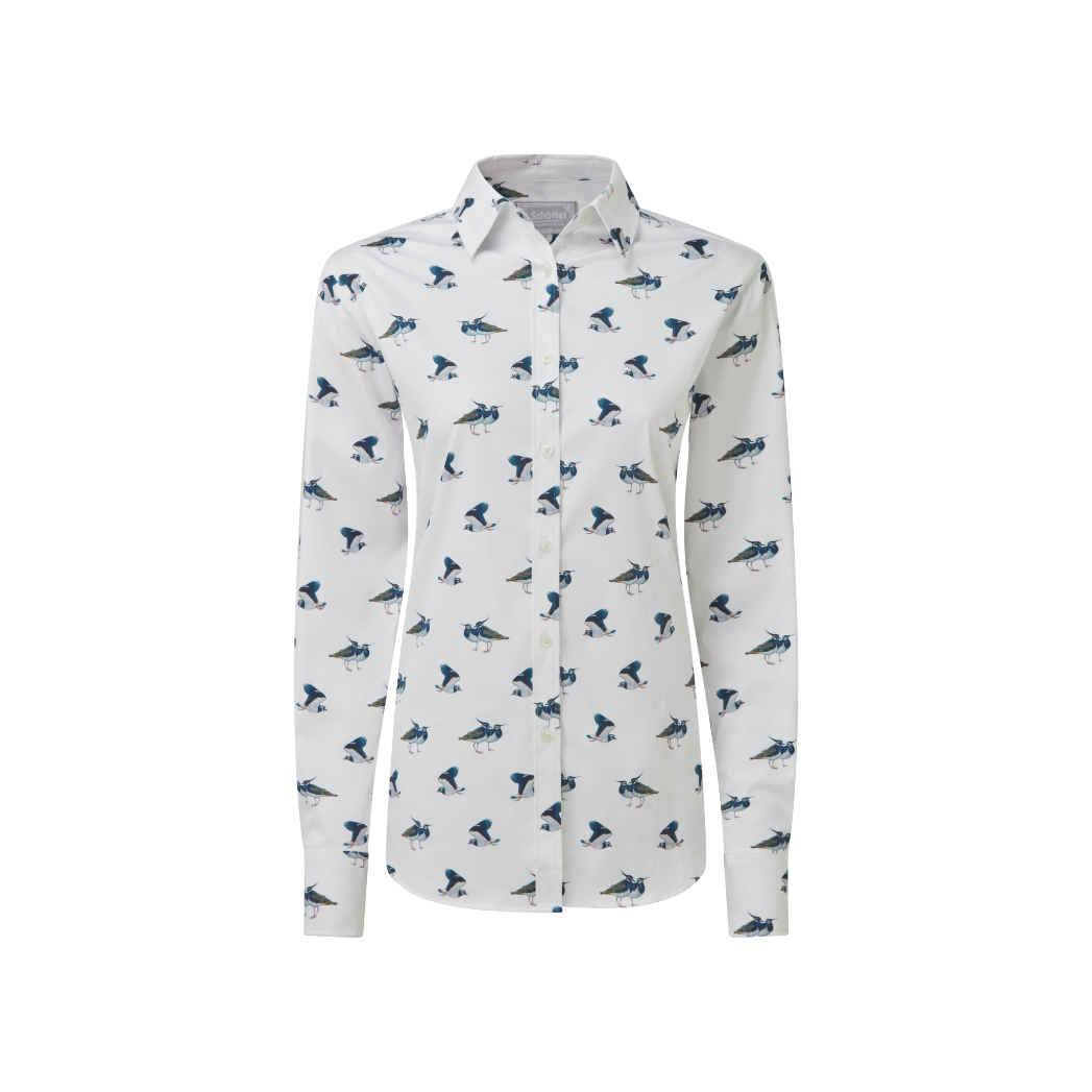 A stylish, crisp white shirt with long sleeves, button-up front, collar, and an all-over bird print.