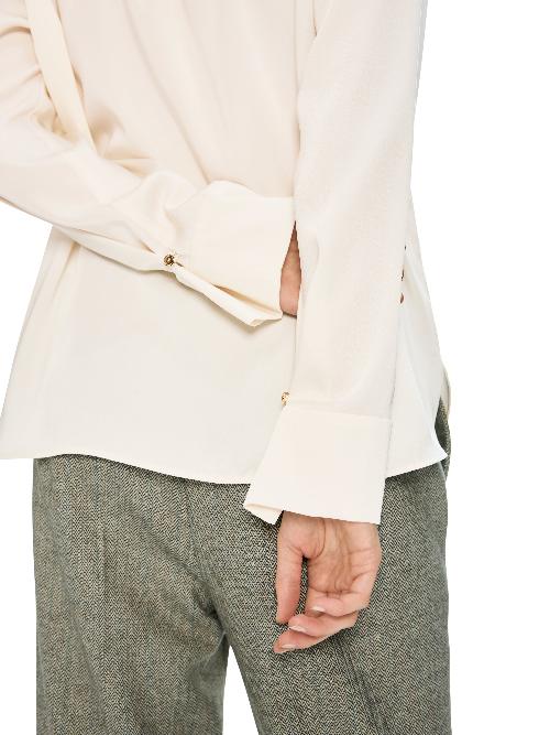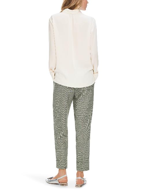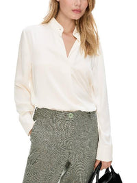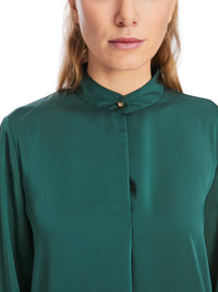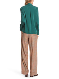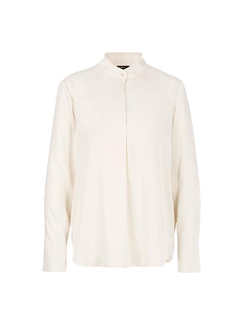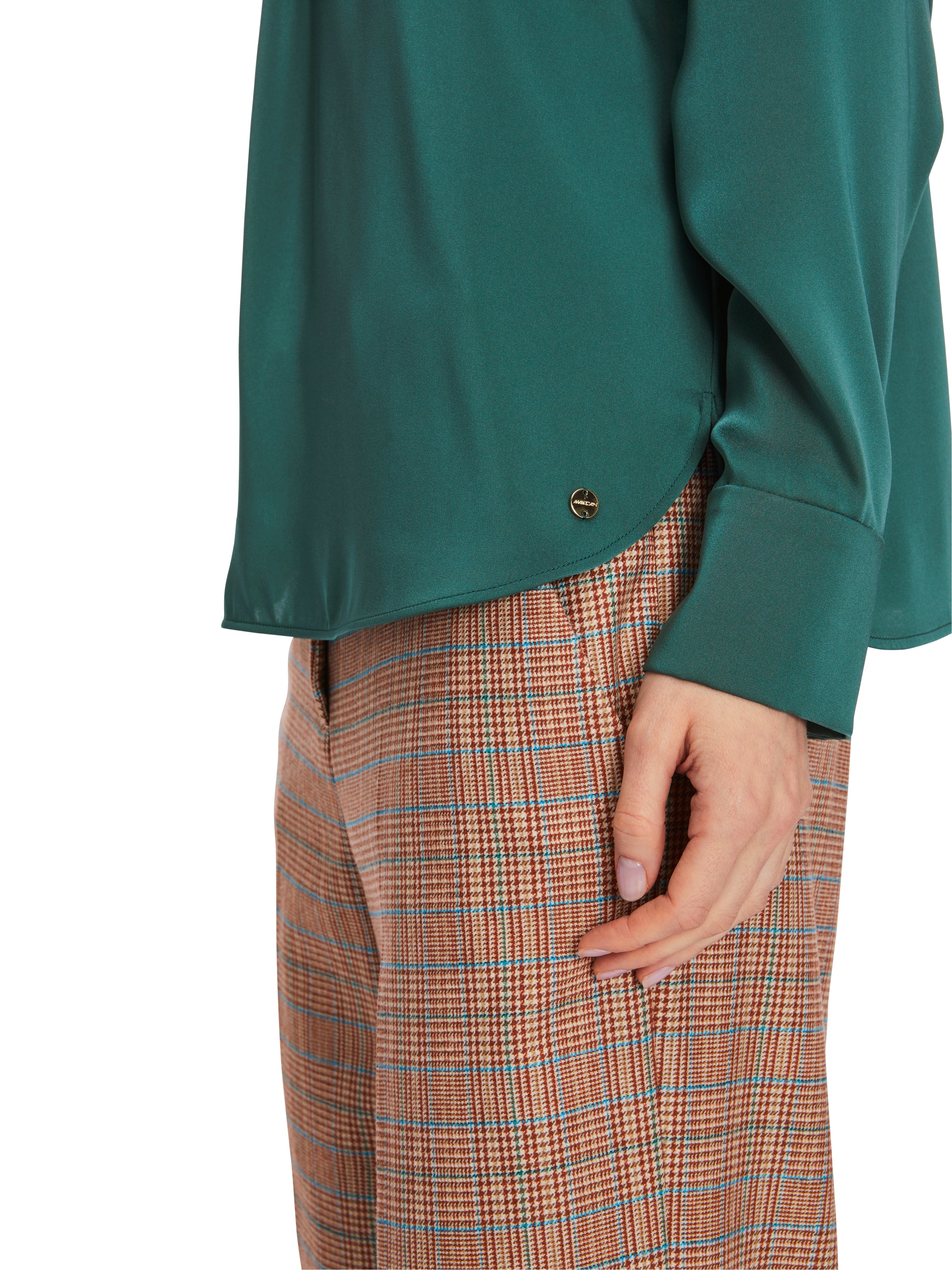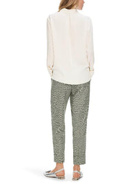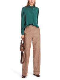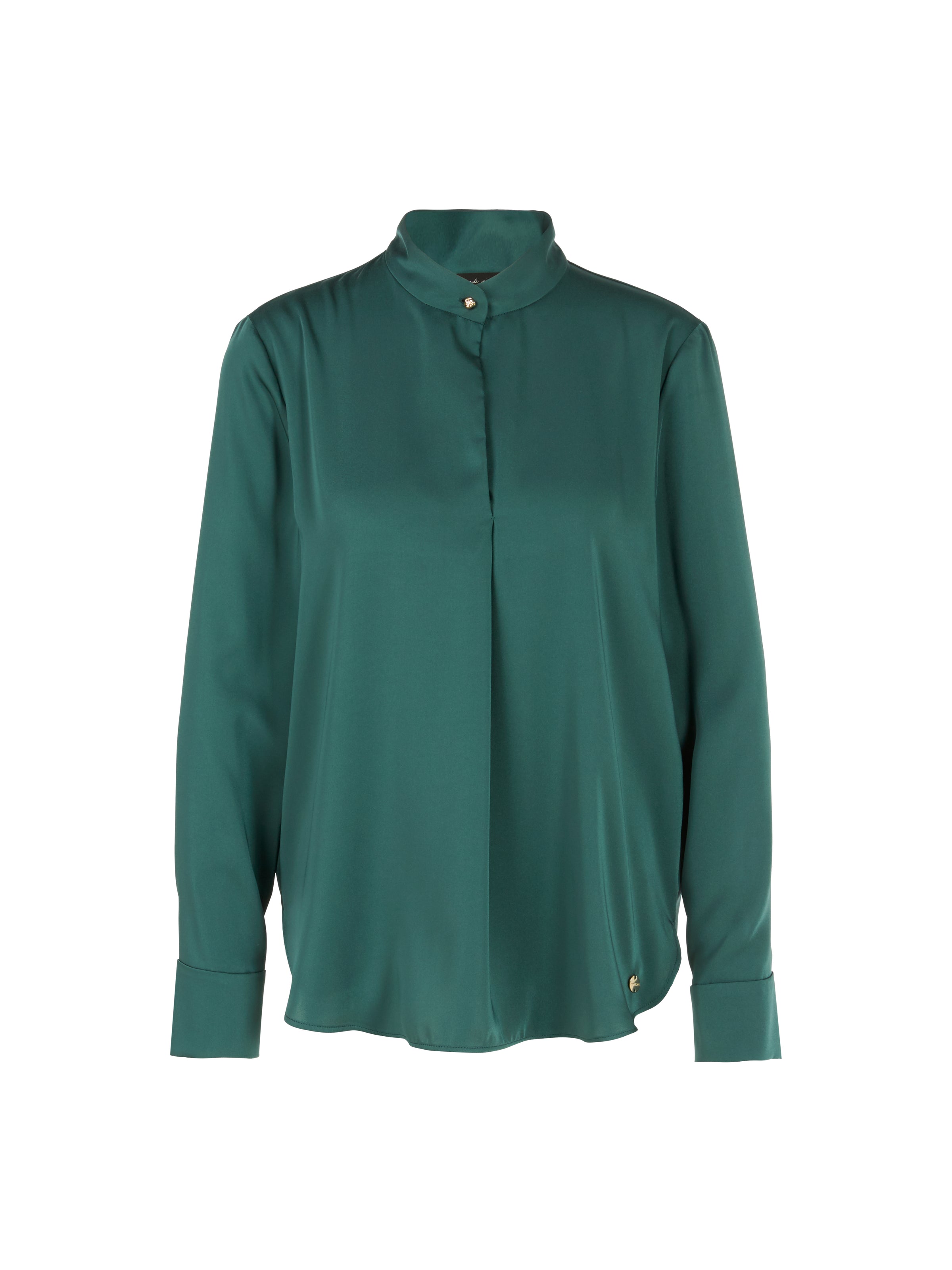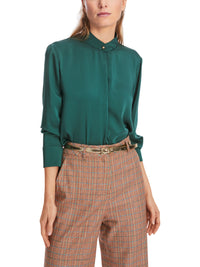 The Marc Cain Blouse exudes effortless sophistication with its loose fit, long sleeves, and flowing material. The stand collar adds a touch of elegance and can be buttoned up for a more refined look. Perfect for any occasion, this blouse is a must-have addition to your wardrobe.