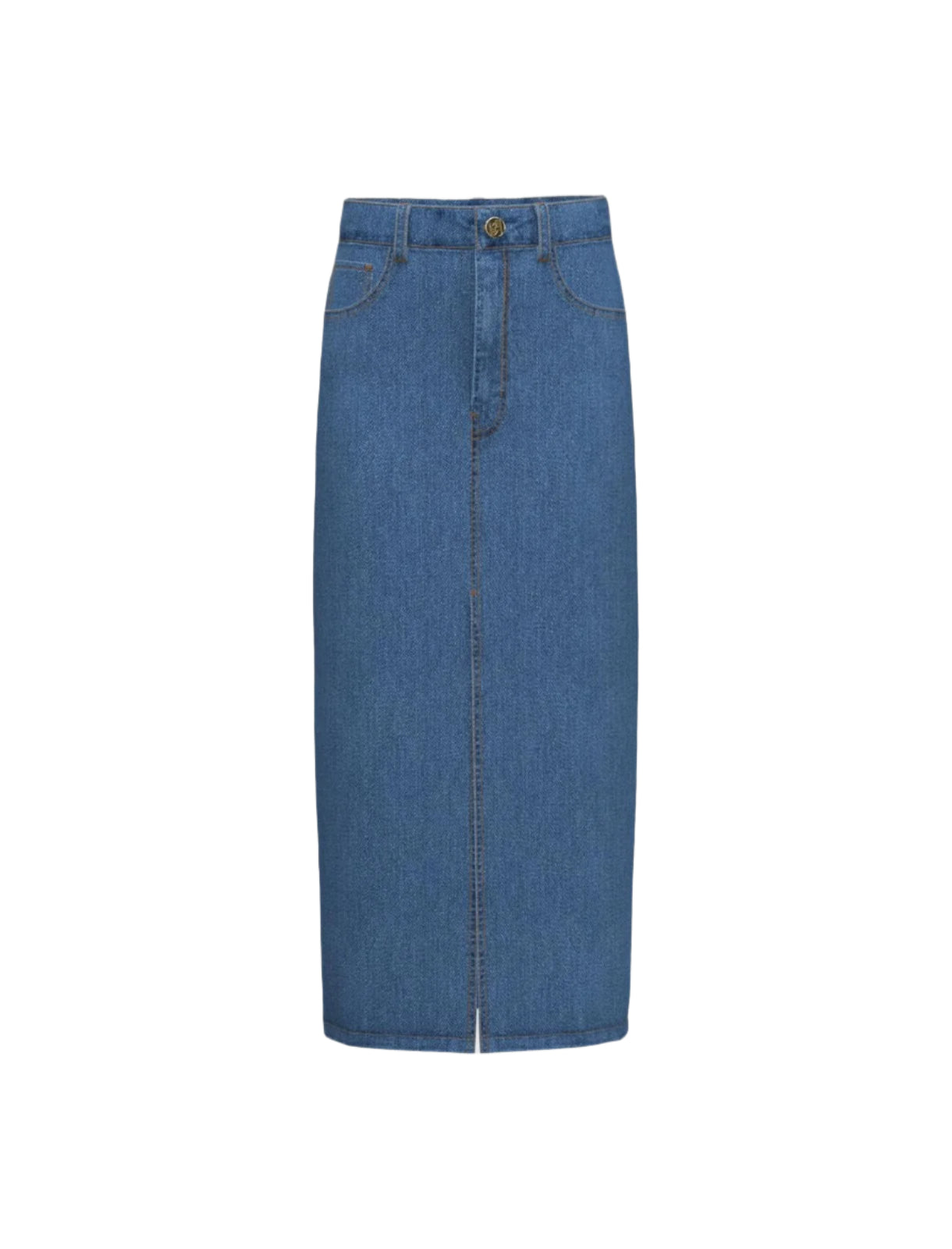 Upgrade your wardrobe with the Emme Liquore Skirt, the epitome of easy, casual, and chic style. This high-waisted, calf-length skirt in garment-dyed light blue denim features a front slit, visible button and fly-covered zip fastening, and a 5-pocket design.