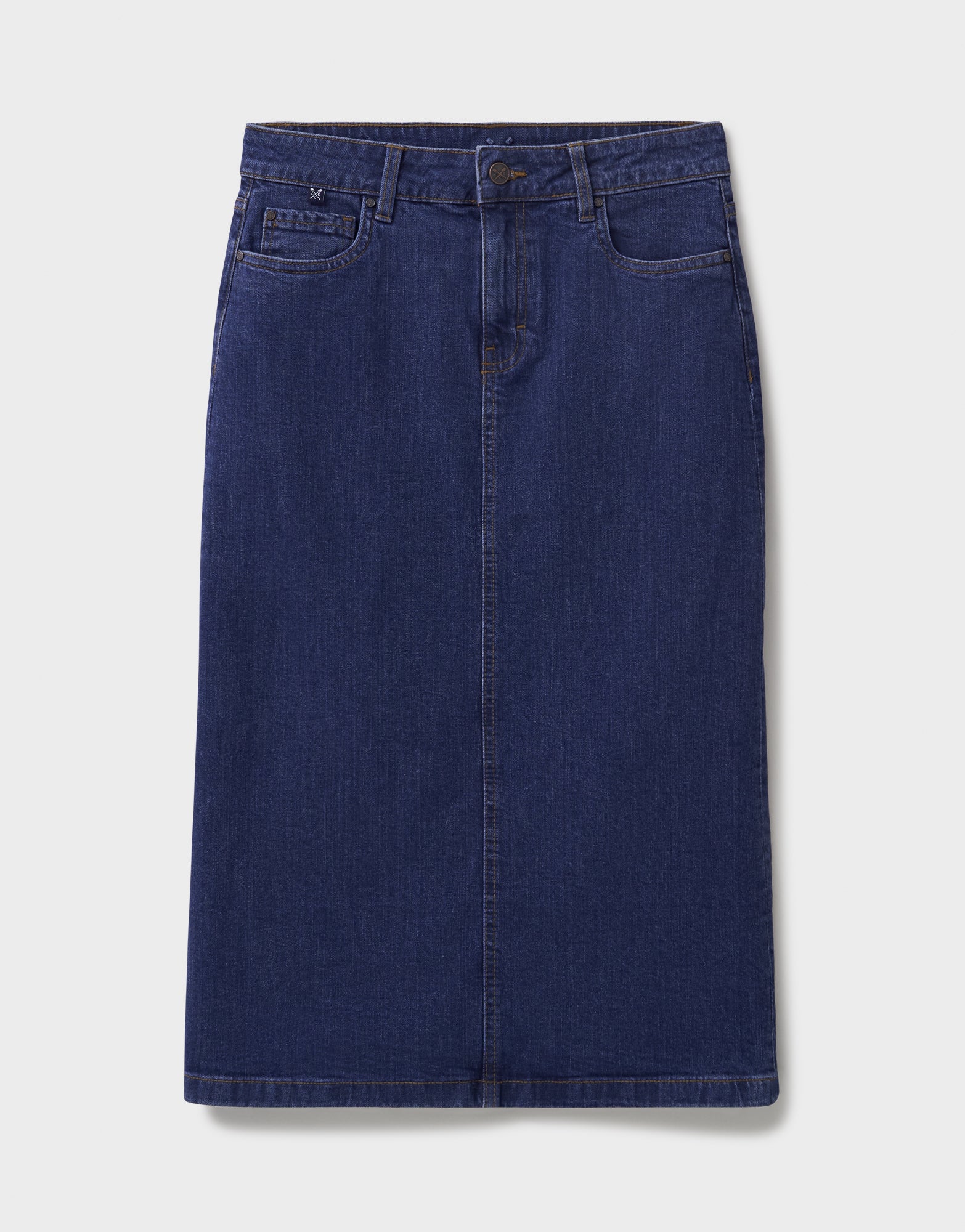 Elevate your style with the Crew Clothing Mia Denim Midi Skirt. Crafted from premium denim, this classic piece features a slight stretch for comfort and a hem split for added flair. The skirt is adorned with sophisticated crew branding and is finished with practical pockets. Zip and button fastening make for a chic and effortless look.