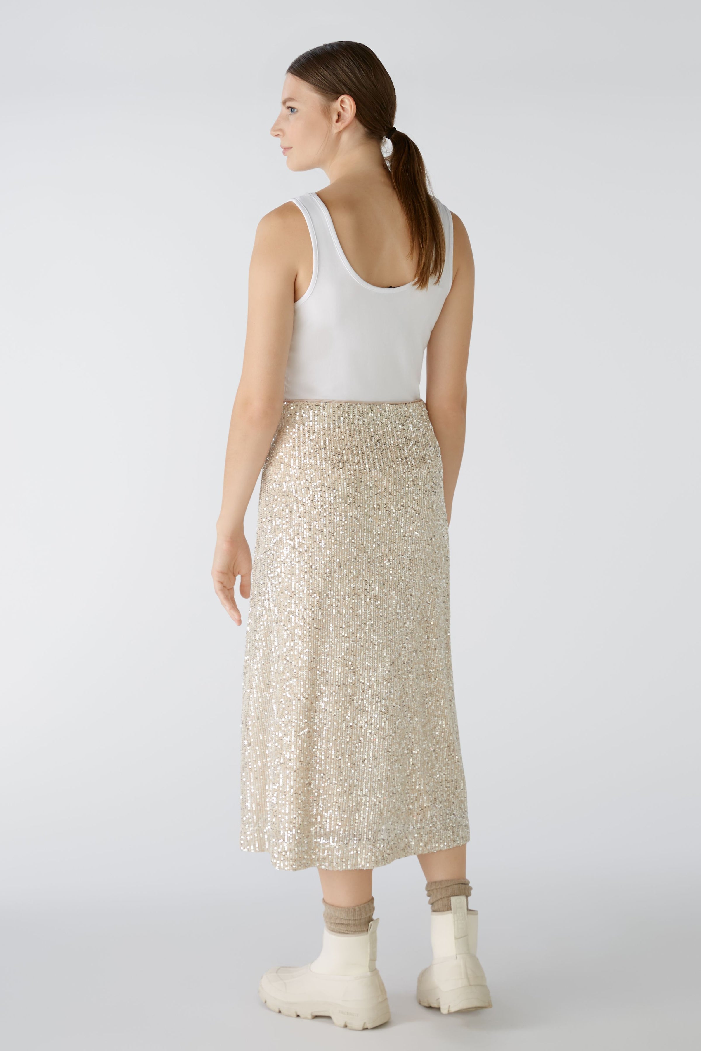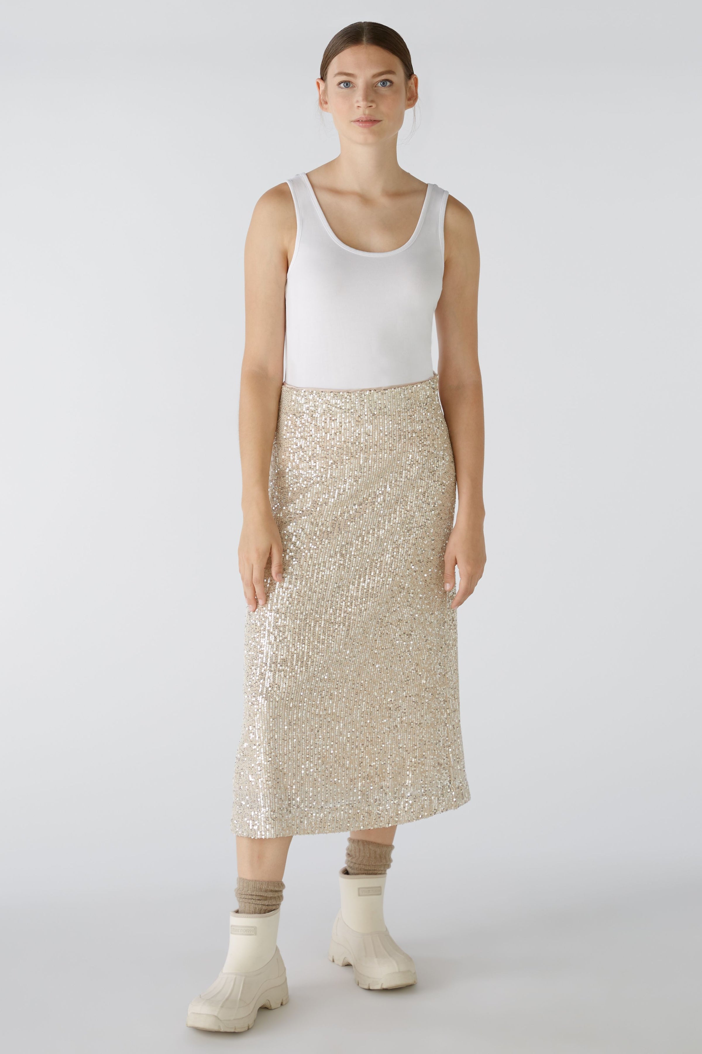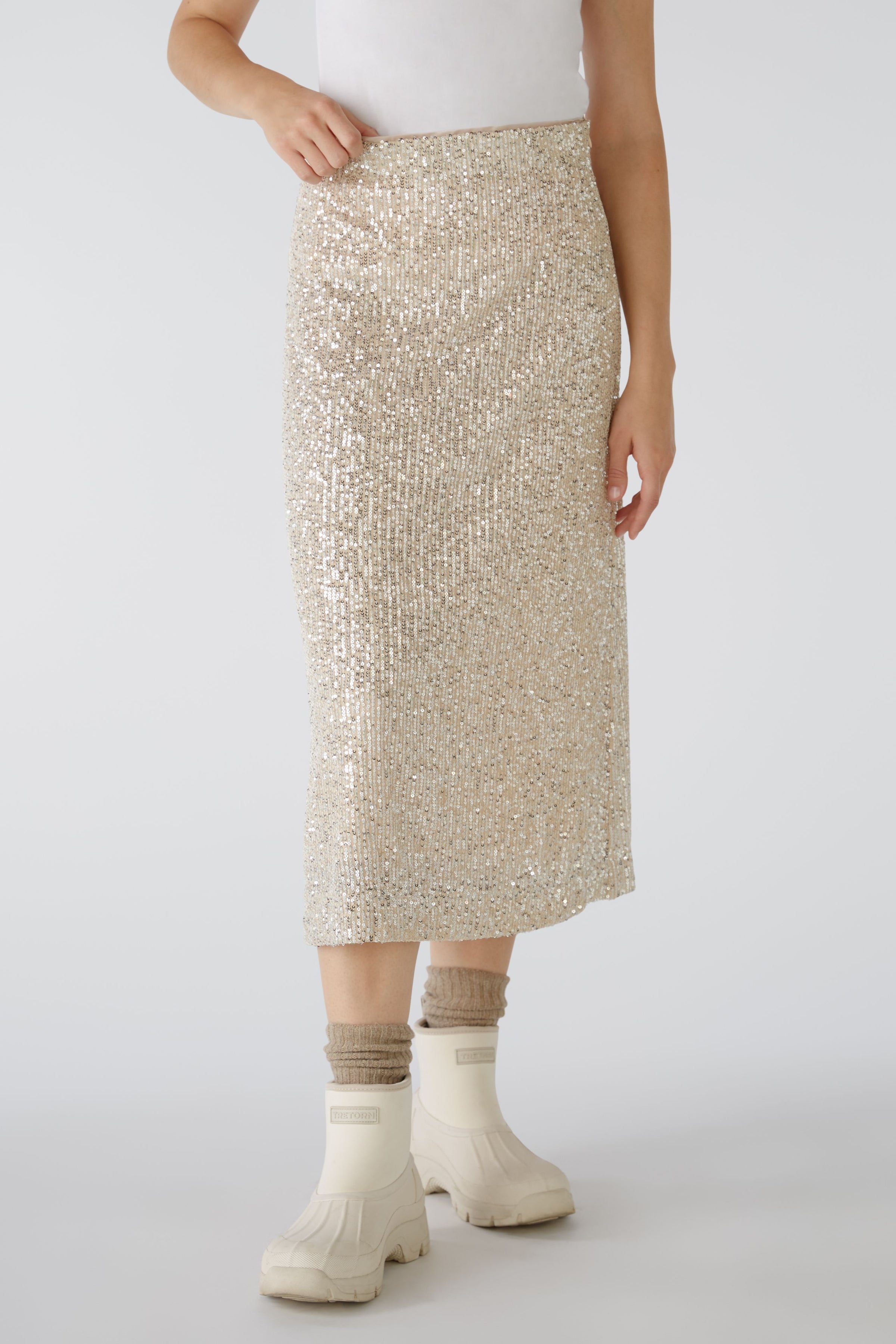 This luxurious midi skirt by Oui features dazzling sequins that will sparkle in the light. The timeless silhouette and sequin fabric make this skirt perfect for special occasions. Effortlessly dress it up or down for any event.