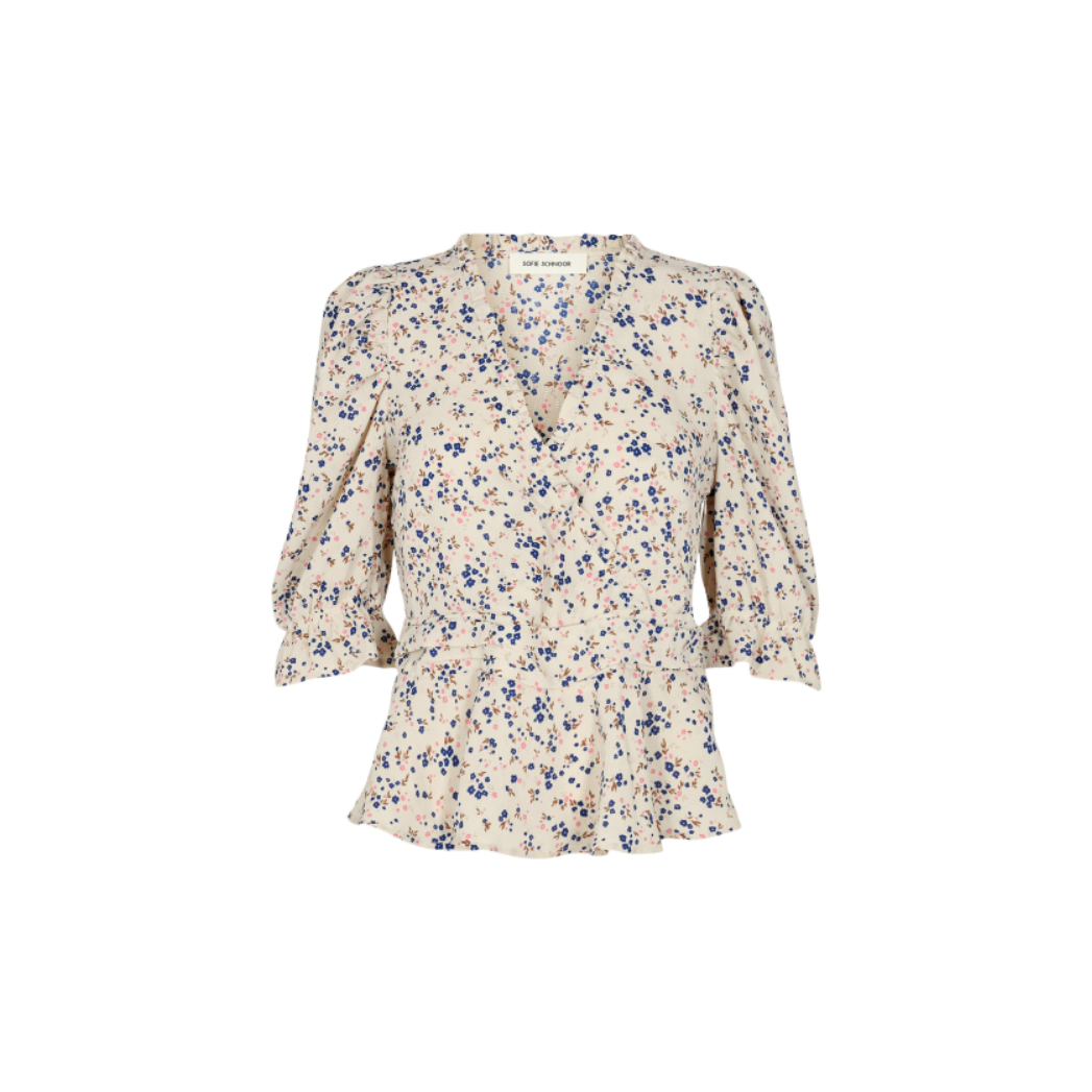 Sofie Schnoor women's wrap front blouse with half sleeves and ruffled cuffs, V neck with a cute floral pattern all over.
