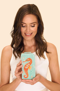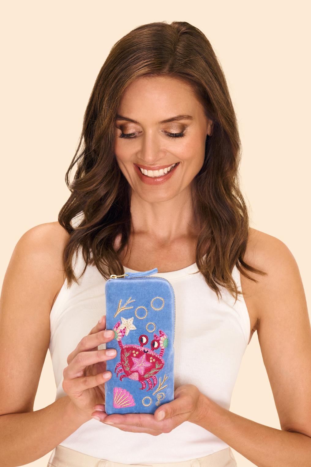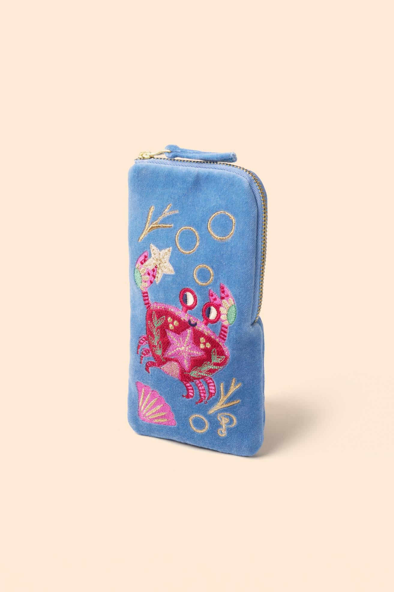 Indulge in pure luxury with the Powder Velvet Sunglasses Pouch. Hand-embroidered with a stunning aqua colourway, this pouch adds elegance to any occasion. Perfect for evening drinks or keeping your sunglasses safe during travel. Make a statement with the beautifully embroidered design.