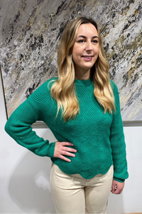 Unwind in style with our Emme Relax Sweater! This slightly cropped sweater features long sleeves, a round neck, and a unique scallop edge hem. Made from a textured material, it's perfect for adding a touch of fun to your wardrobe. Take your comfort game to the next level with this playful and cosy jumper!