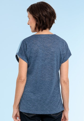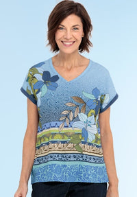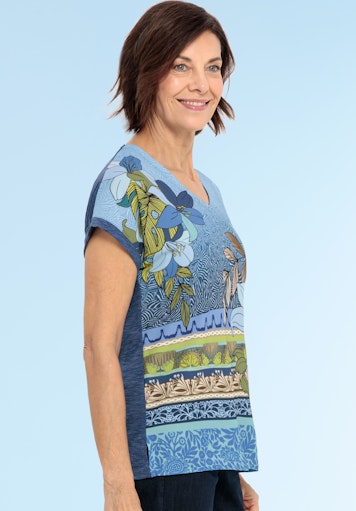 Elevate your wardrobe with the Bianca Julie T-Shirt, a perfect blend of style and comfort. This fashionable V-neck shirt features an eye-catching print design complemented by a sleek plain knit back. The high-quality material mix ensures all-day comfort, while its straight, slightly loose fit flatters every figure.