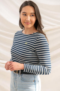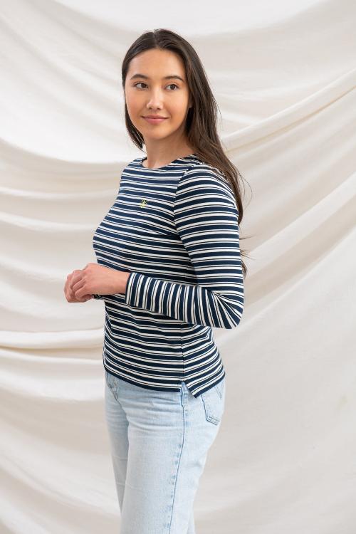 The Lighthouse Ladies Causeway Top is a must-have for any wardrobe. The Breton stripe design is timeless and its breathable cotton fabric, complemented by stretch technology, ensures maximum comfort. The boat neck and long sleeves add a touch of elegance, while the Lighthouse embroidered logo adds a touch of sophistication. This regular fit top is perfect for any occasion, making it a versatile and stylish choice.