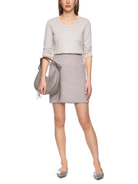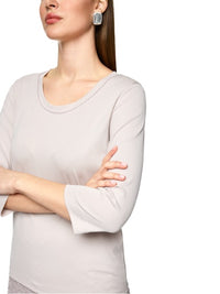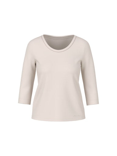 The Marc Cain T-Shirt with Chain Trim features a subtle tailored fit. The round neckline is enhanced by a delicate chain link trim, adding a distinctive touch of sophistication. Three-quarter length sleeves offer a graceful silhouette, while the soft cotton-elastane blend ensures exceptional comfort throughout the day. Ideal for those seeking a polished yet comfortable wardrobe staple.