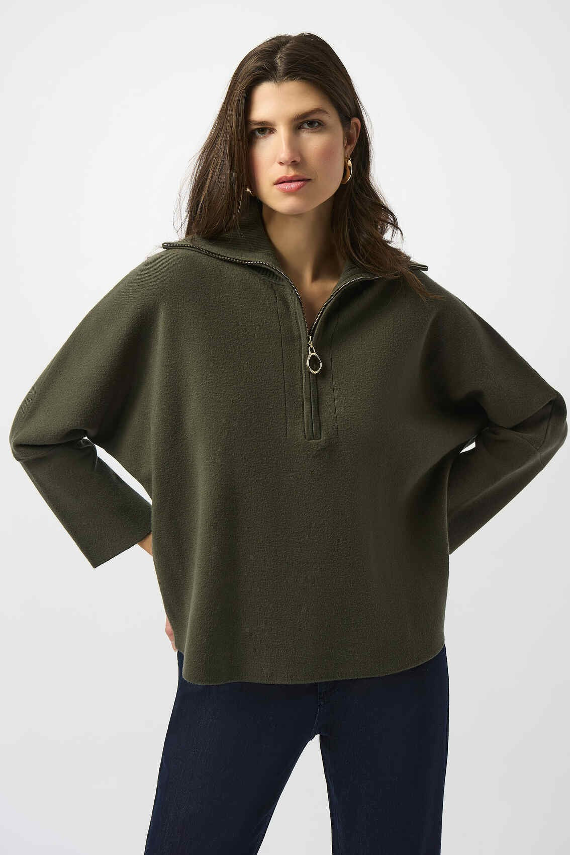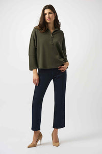 The elegant Joseph Ribkoff Knitted Sweater features a zipped front neckline and stylish bell sleeves, offering a refined silhouette with a modern twist. Crafted without lining, it provides lightweight comfort while maintaining a polished look, perfect for layering or wearing on its own during transitional seasons.