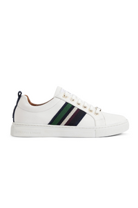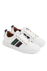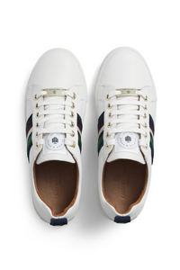 Elevate your style with the Fairfax & Favor Boston Leather Trainer. Designed for women, these chic sneakers feature a unique webbing side detail with plum, cream, and forest green panels. The lace up fastening, rubber sole, and padded insole provide comfort and durability. Upgrade your wardrobe and step out in style!