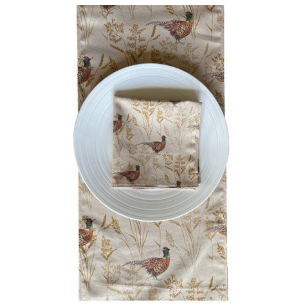 Vanessa Bathgate table runner with original pheasant artwork inspired by the Scottish Highlands.