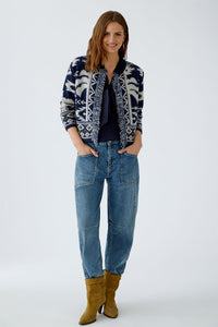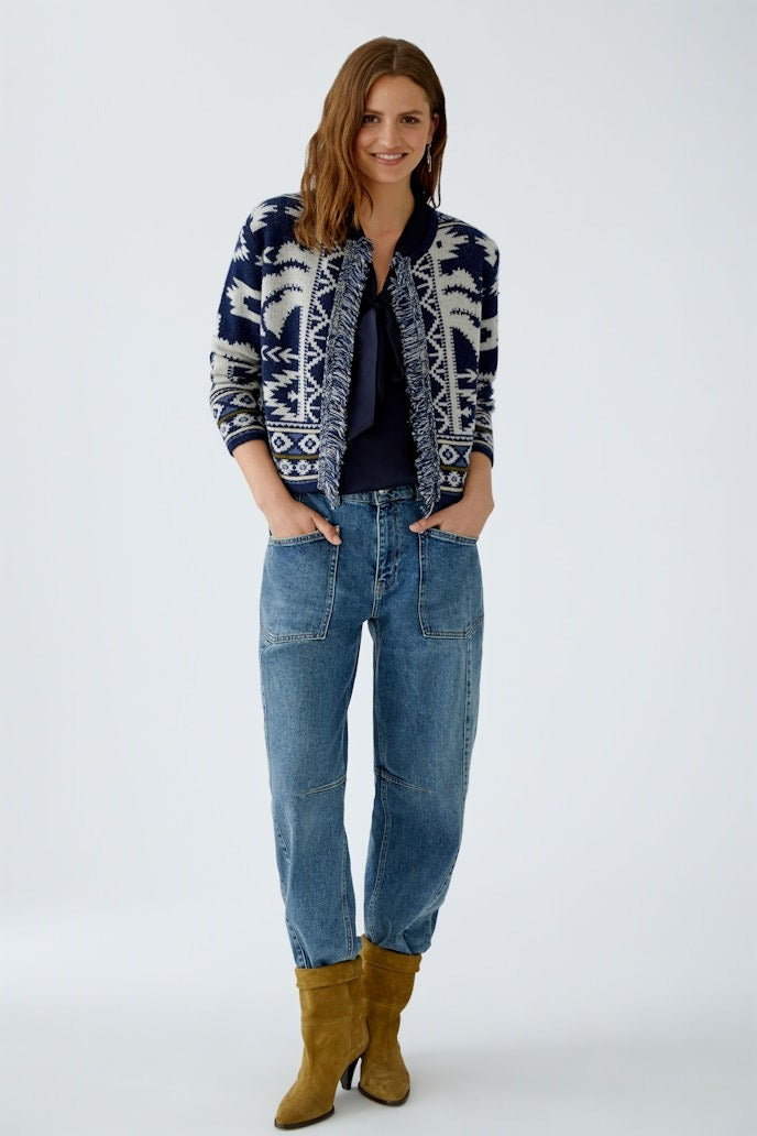 The Oui Cardigan features a very soft jacquard-knit yarn blend in calming shades of blue with a hint of olive, offering both comfort and style. Its narrow, shortened cut flatters your silhouette, while the round neck with a placket and hook fastening adds a refined touch. Shoulder pads enhance the structure, and long, straight sleeves with border finishes provide a sleek look. Delicate fringing along the open edge, woven with subtle lustre yarn, adds an elegant detail that elevates any outfit.