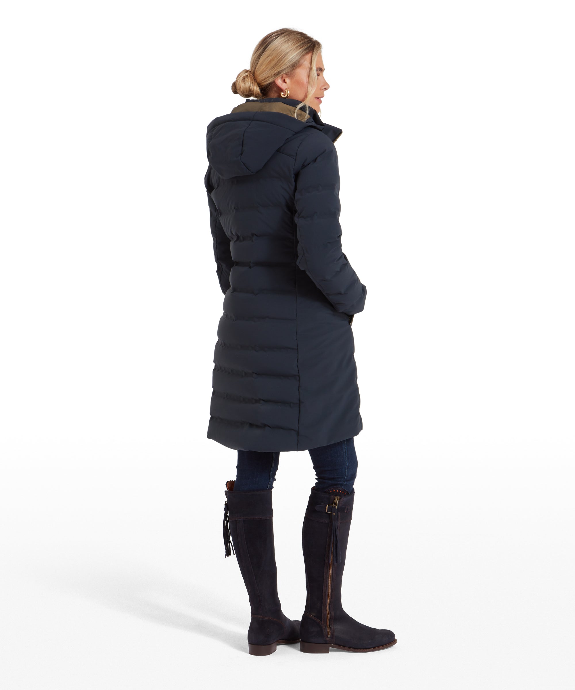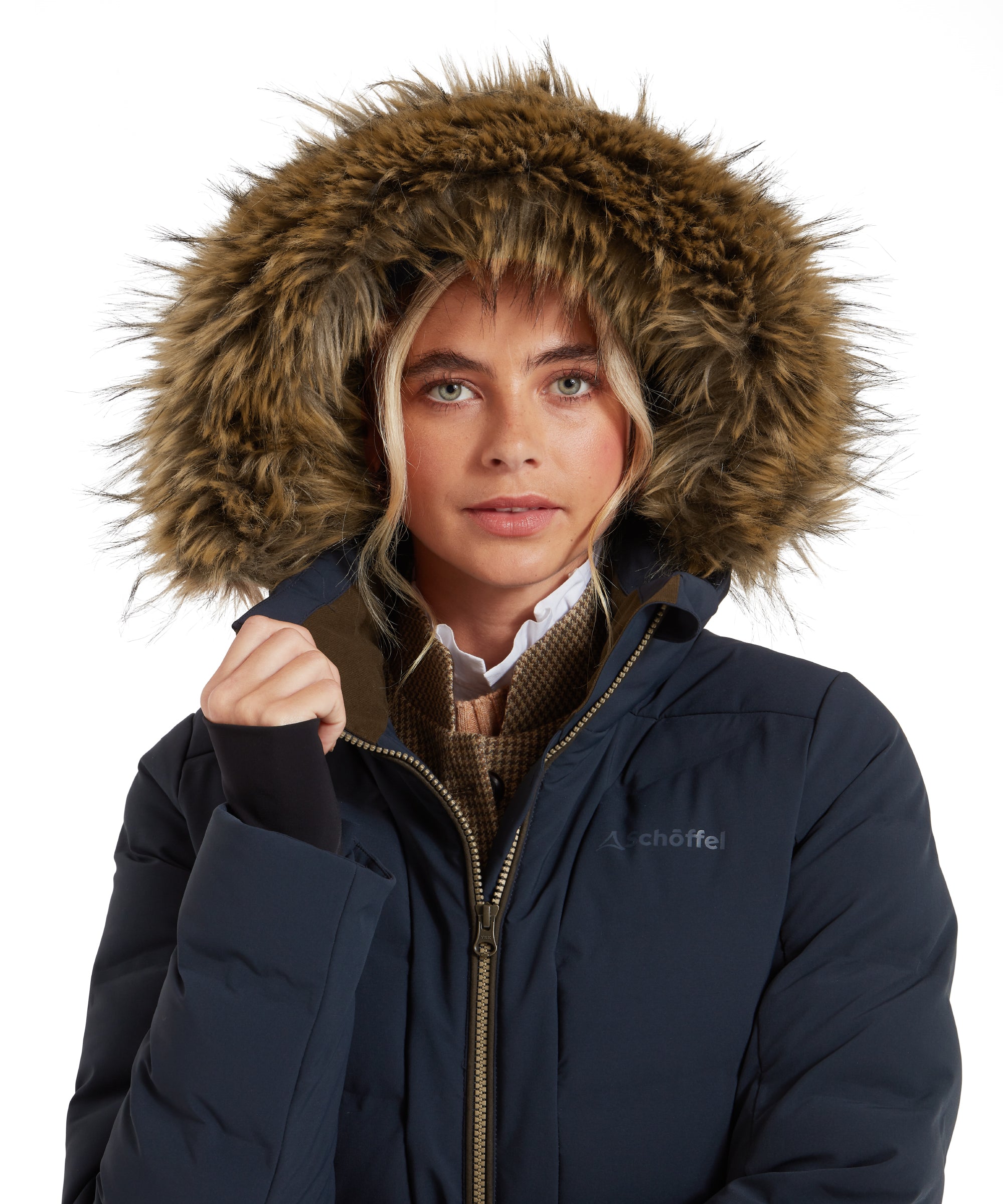 Stay warm, dry, and stylish with the Schoffel Hurlingham Waterproof Down Coat. This thigh-length coat features a two-way zip fastening and detachable hood with a removable faux fur trim. The Schoffel logo embroidery adds a touch of sophistication. With down fill, waterproof and windproof materials, and breathability, this coat is the ultimate blend of fashion and functionality.