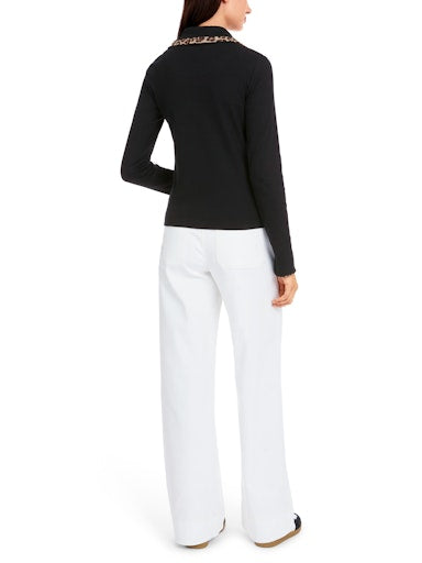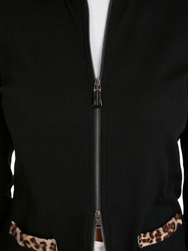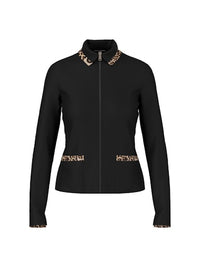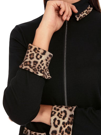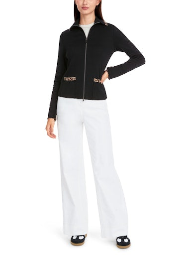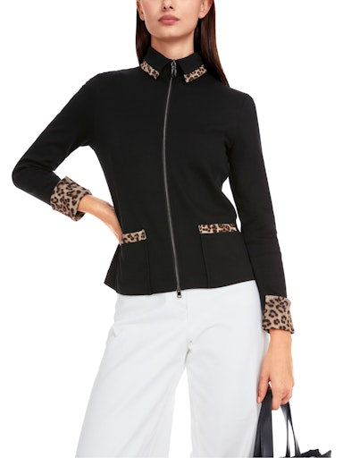Introducing the lightweight and versatile Marc Cain Zip Jacket, made from soft and breathable cotton rib. With a slim and straight fit, this jacket features a shirt collar and convenient zip and patch pockets. The collar and hems are beautifully accented with a leopard print trim, adding a touch of style.