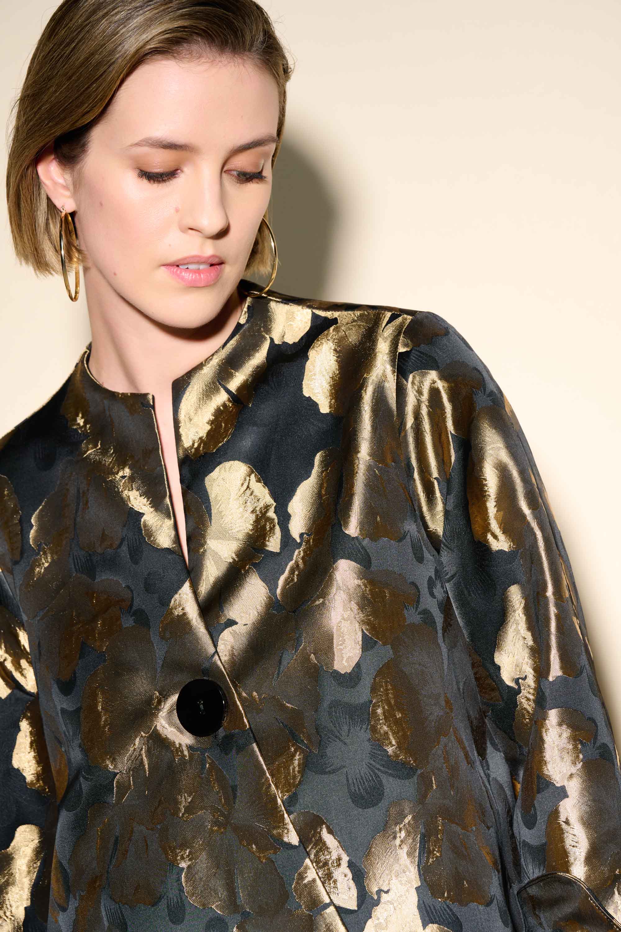 This stylishly draped Joseph Ribkoff jacket is expertly crafted in textured floral fabric, featuring an elegant black and bronze colour palette.