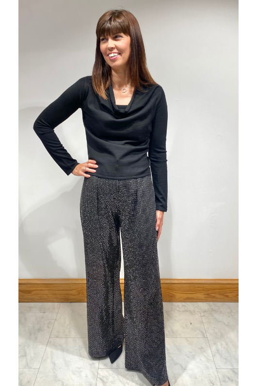 The Marella Oronte Trouser provides an elegant look, crafted with black fabric and subtle glitter detailing. With a flattering fit and timeless design, these trousers will give you a polished style for any occasion.