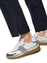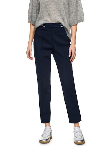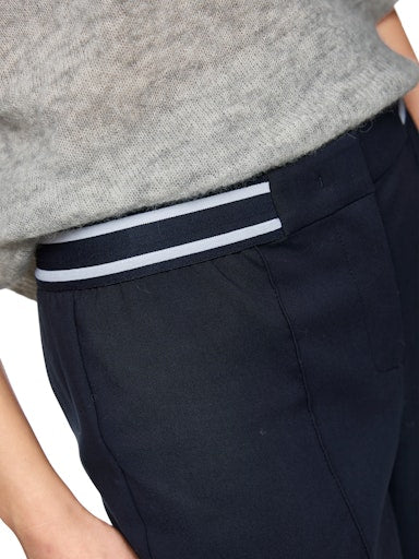 The Marc Cain Sydney Trousers combine style and sustainability with a slim fit and stitched crease for a sharp look. Crafted from organic cotton and recycled materials, they offer comfort and style. The button, hook, and zip fastening, along with a striped stretch waistband, ensure a perfect fit all day long. Elevate your outfits with these smart trousers.