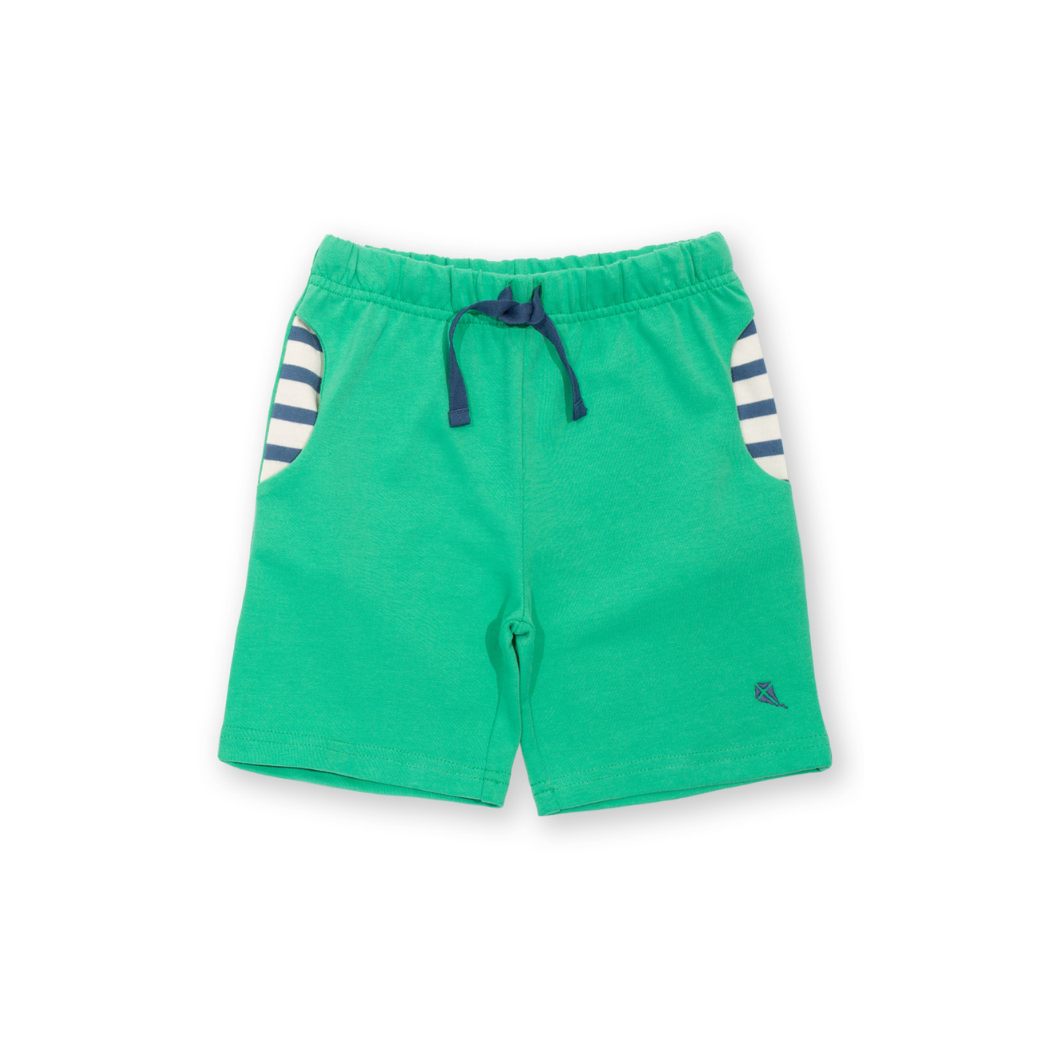Kite kid's shorts with contrast pattern striped pockets and a plain green colour.