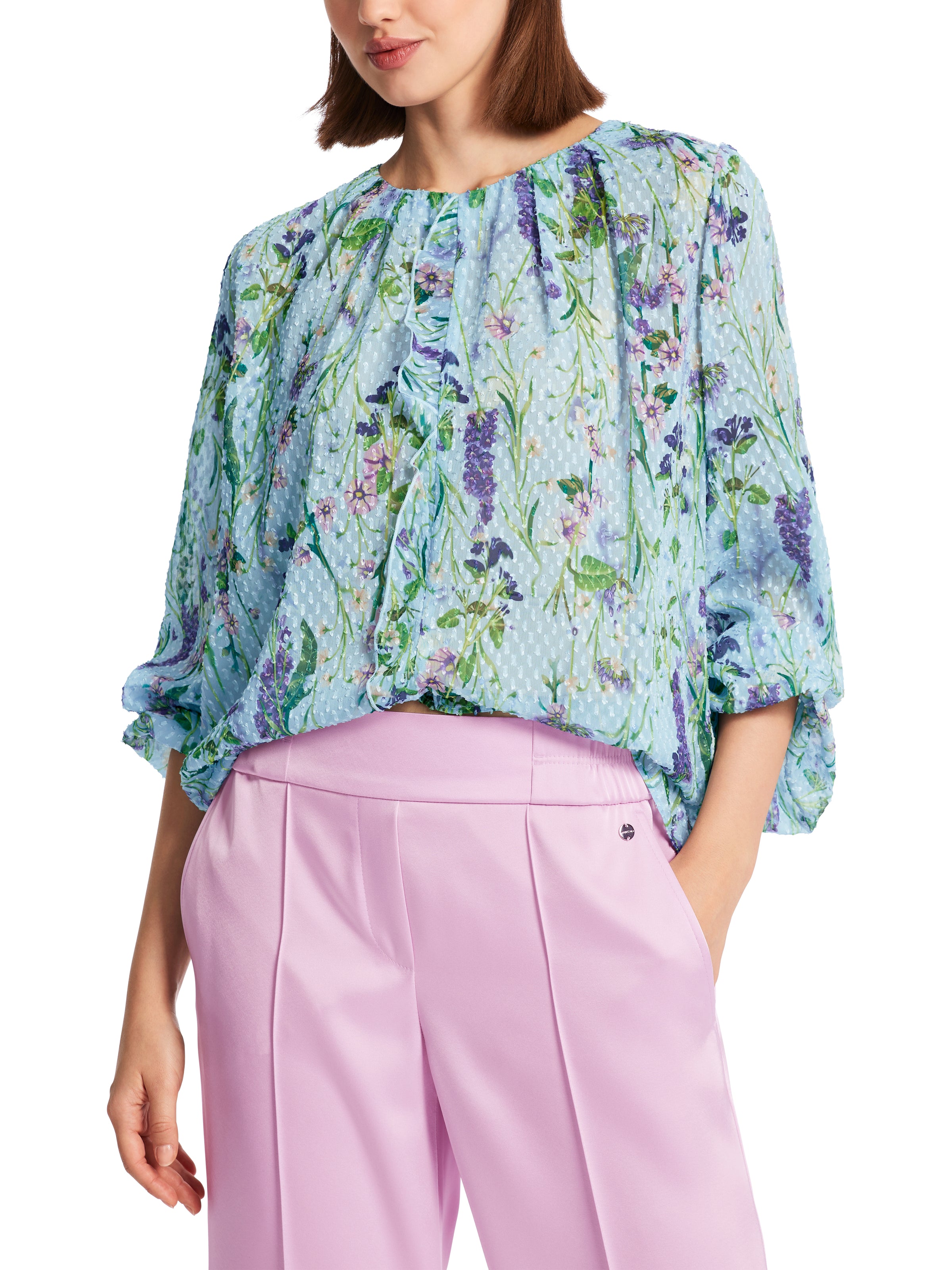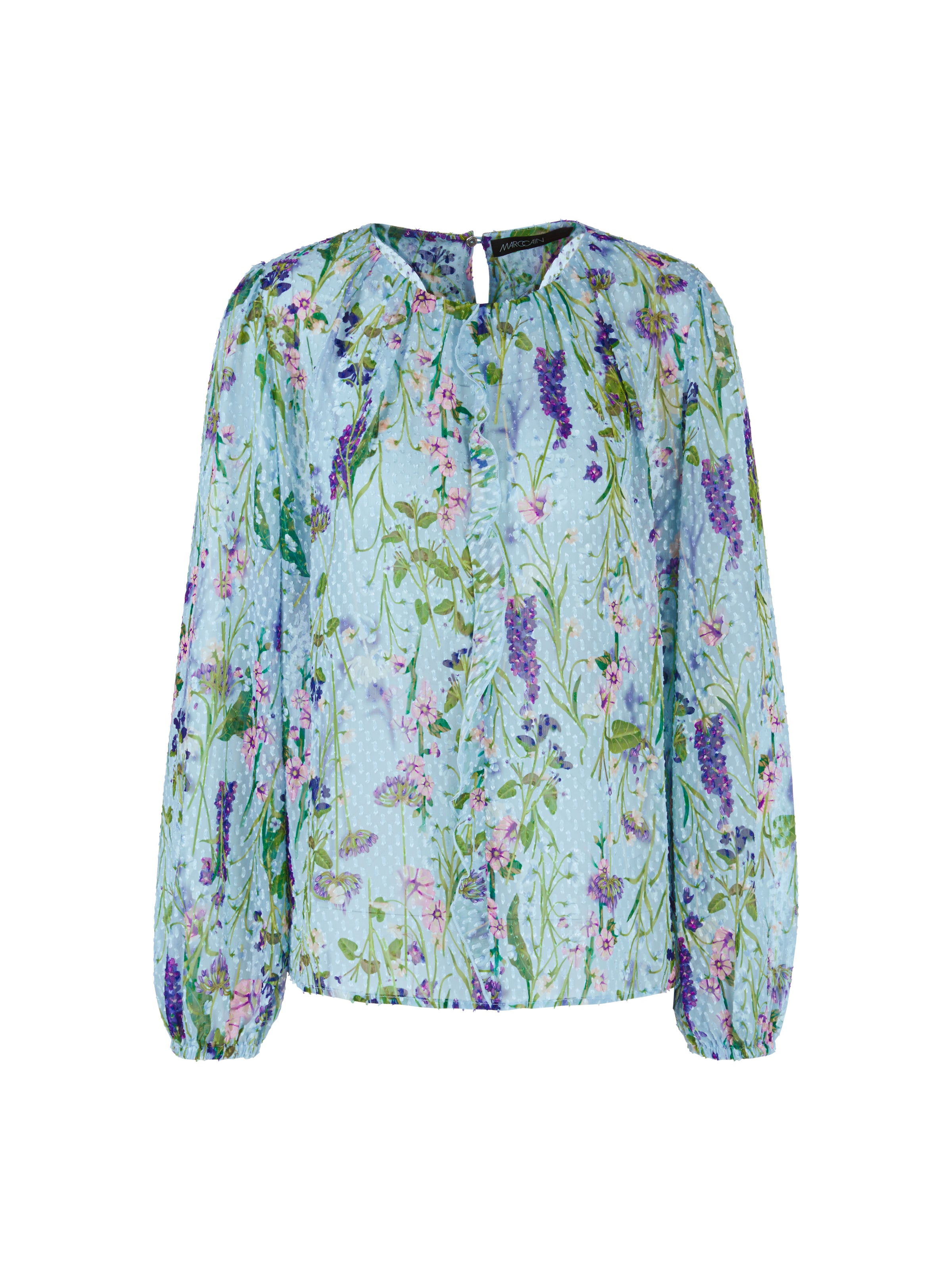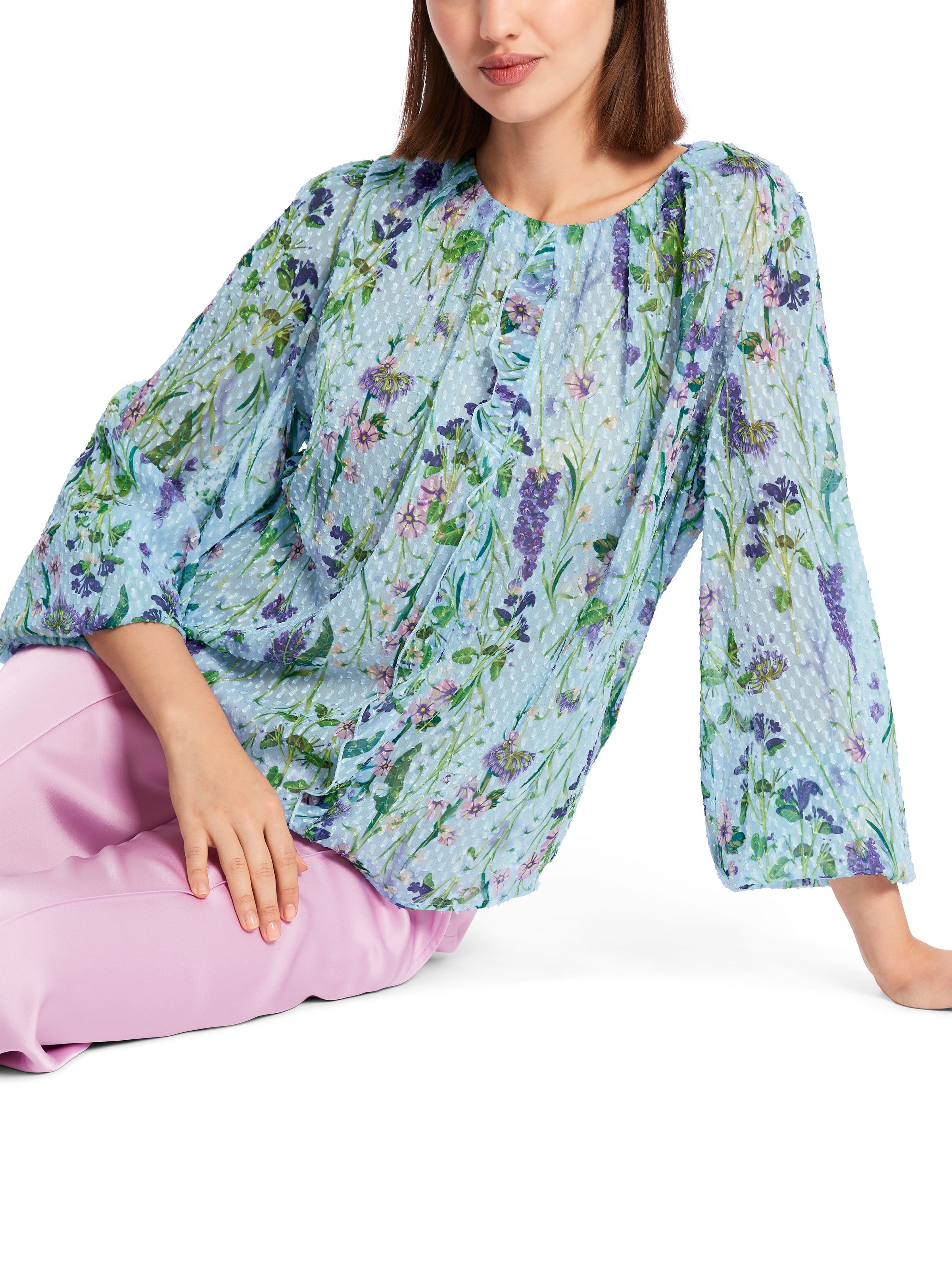 The Marc Cain Floral Sheer Blouse features a relaxed cut and lightweight fabric for ultimate comfort. With long sleeves and elasticated cuffs, it offers a versatile and elegant look. The round neckline with a slit adds a touch of sophistication, while the delicate floral design lends a feminine and stylish aesthetic. Perfect for any occasion.