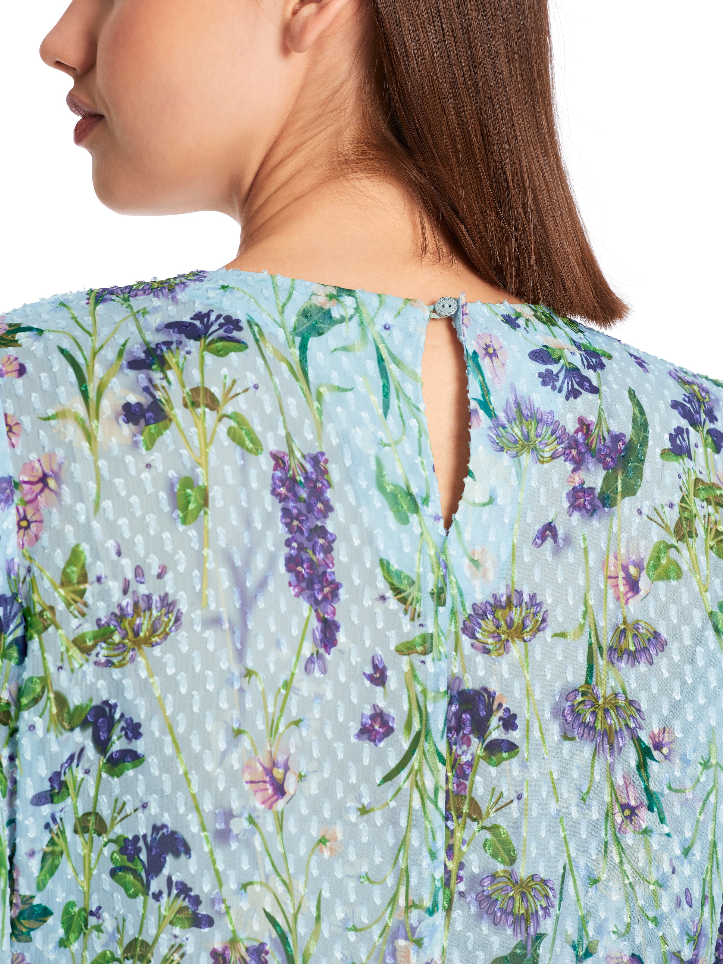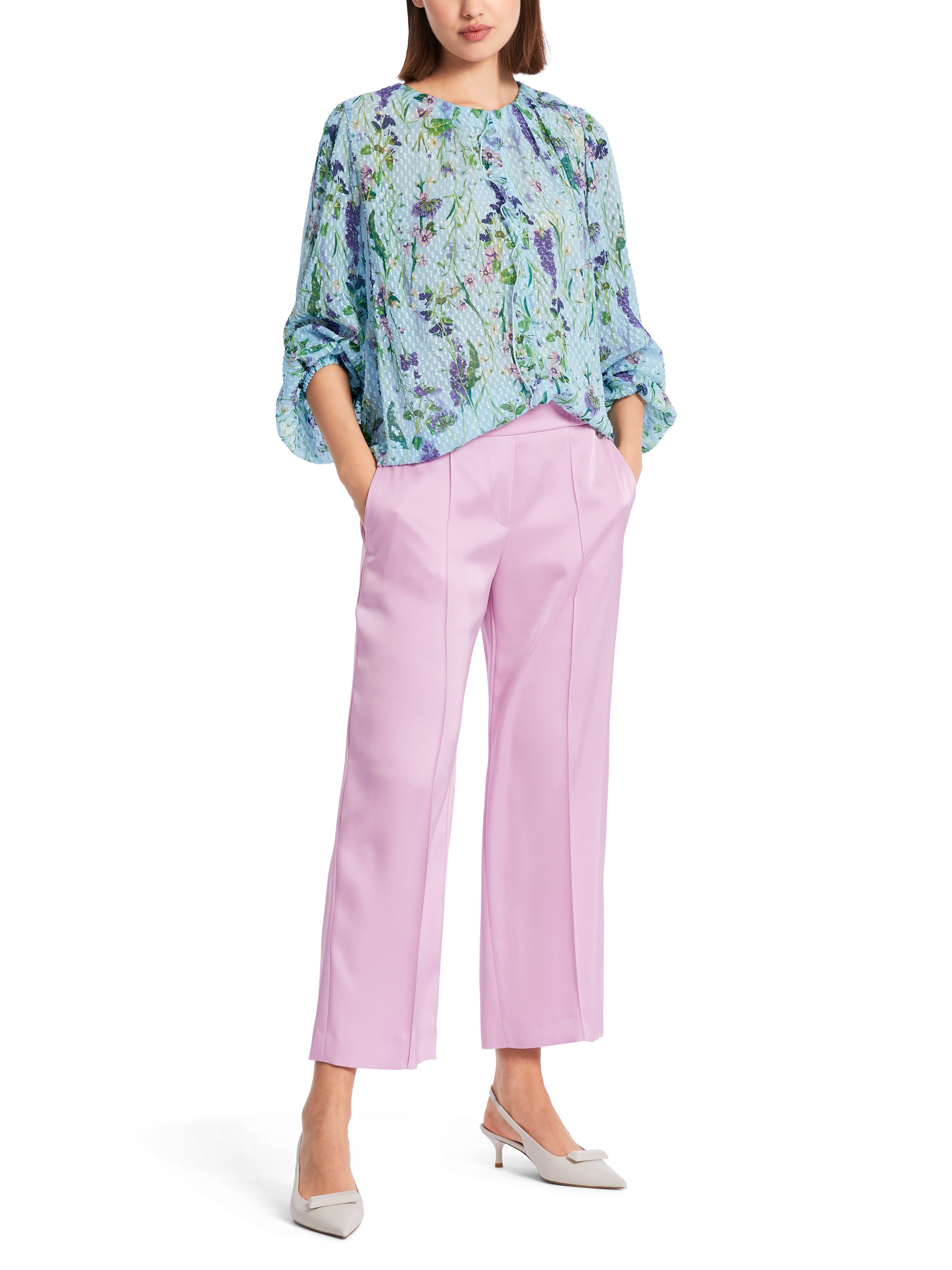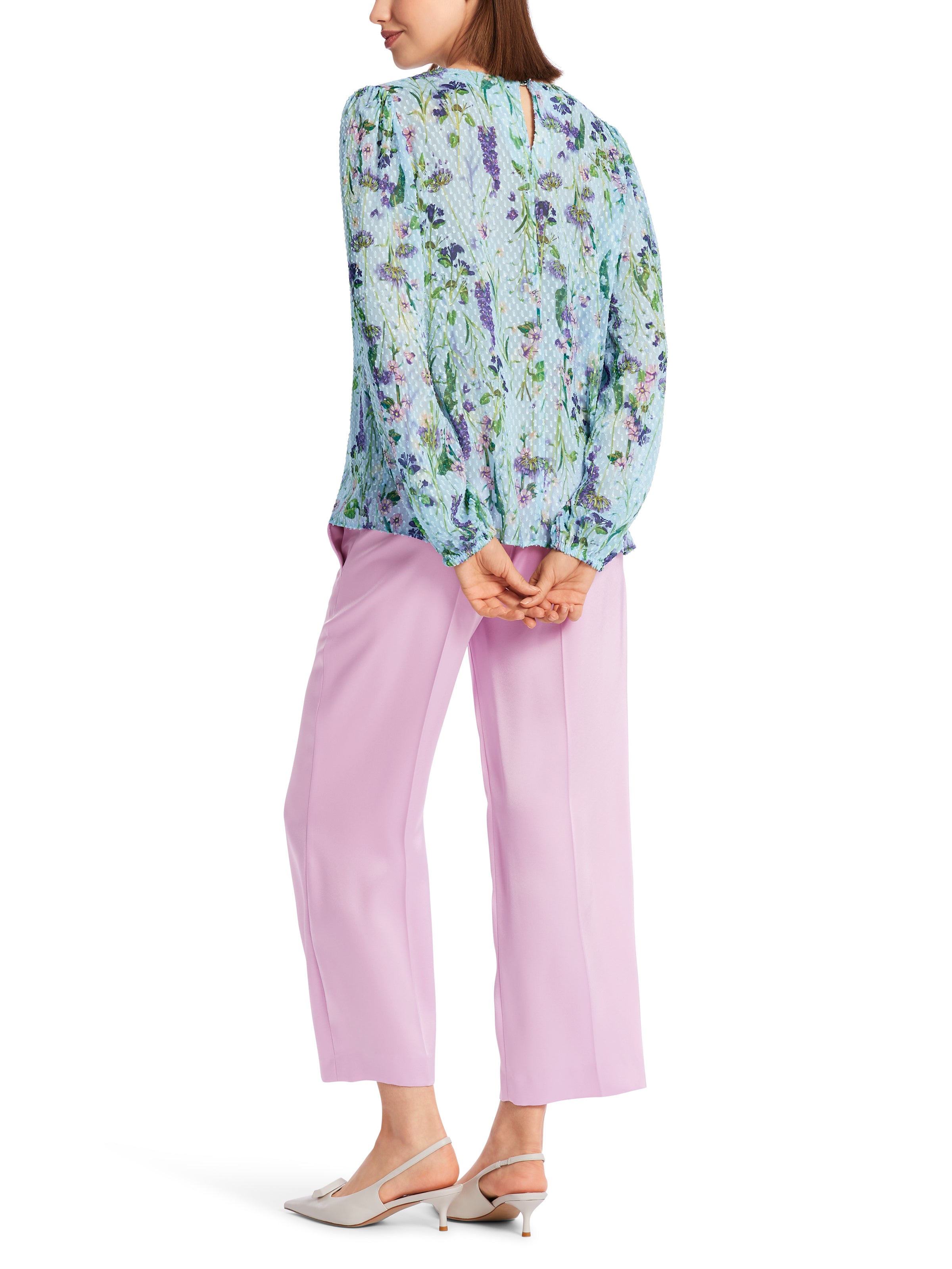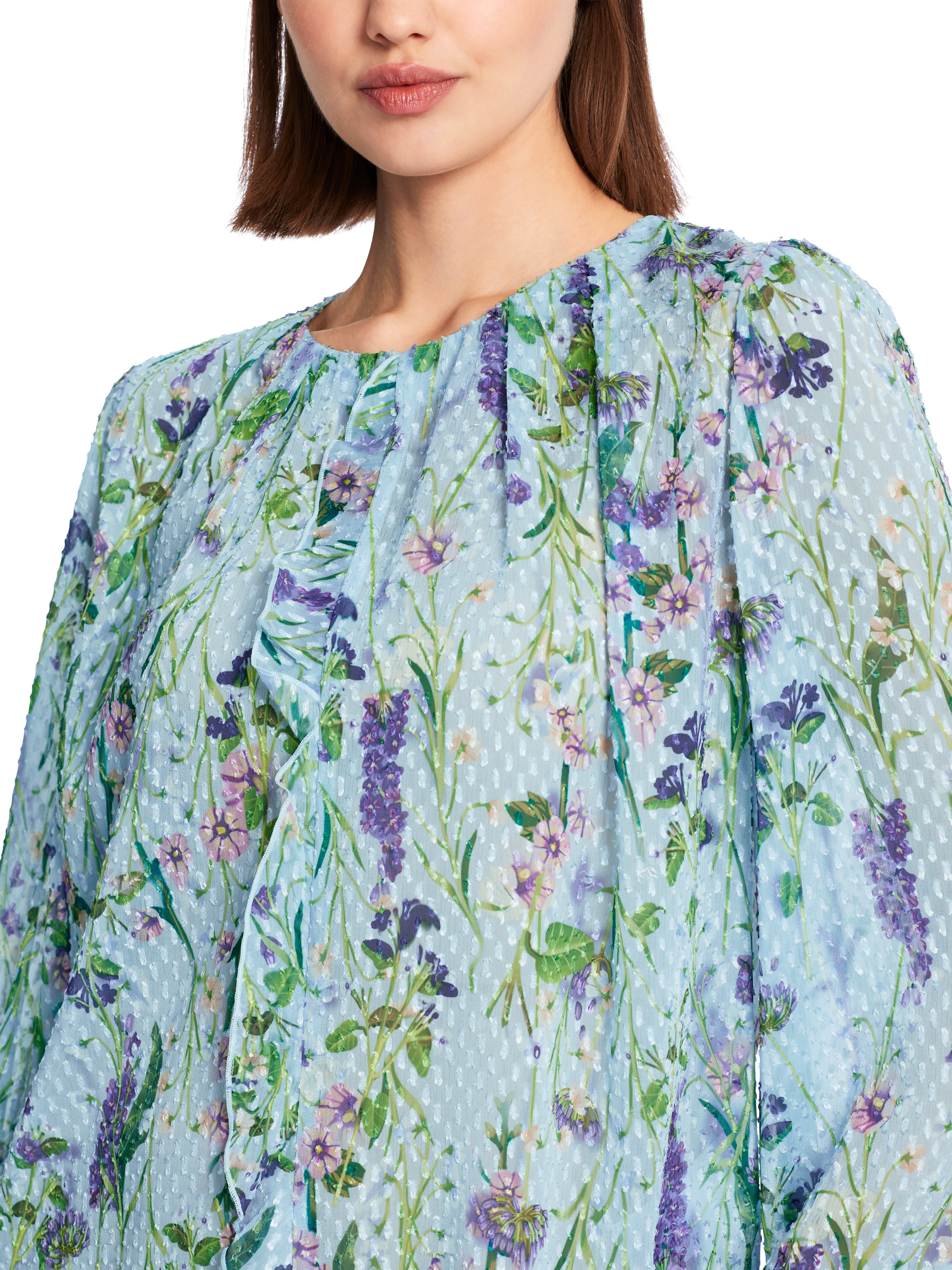 The Marc Cain Floral Sheer Blouse features a relaxed cut and lightweight fabric for ultimate comfort. With long sleeves and elasticated cuffs, it offers a versatile and elegant look. The round neckline with a slit adds a touch of sophistication, while the delicate floral design lends a feminine and stylish aesthetic. Perfect for any occasion.